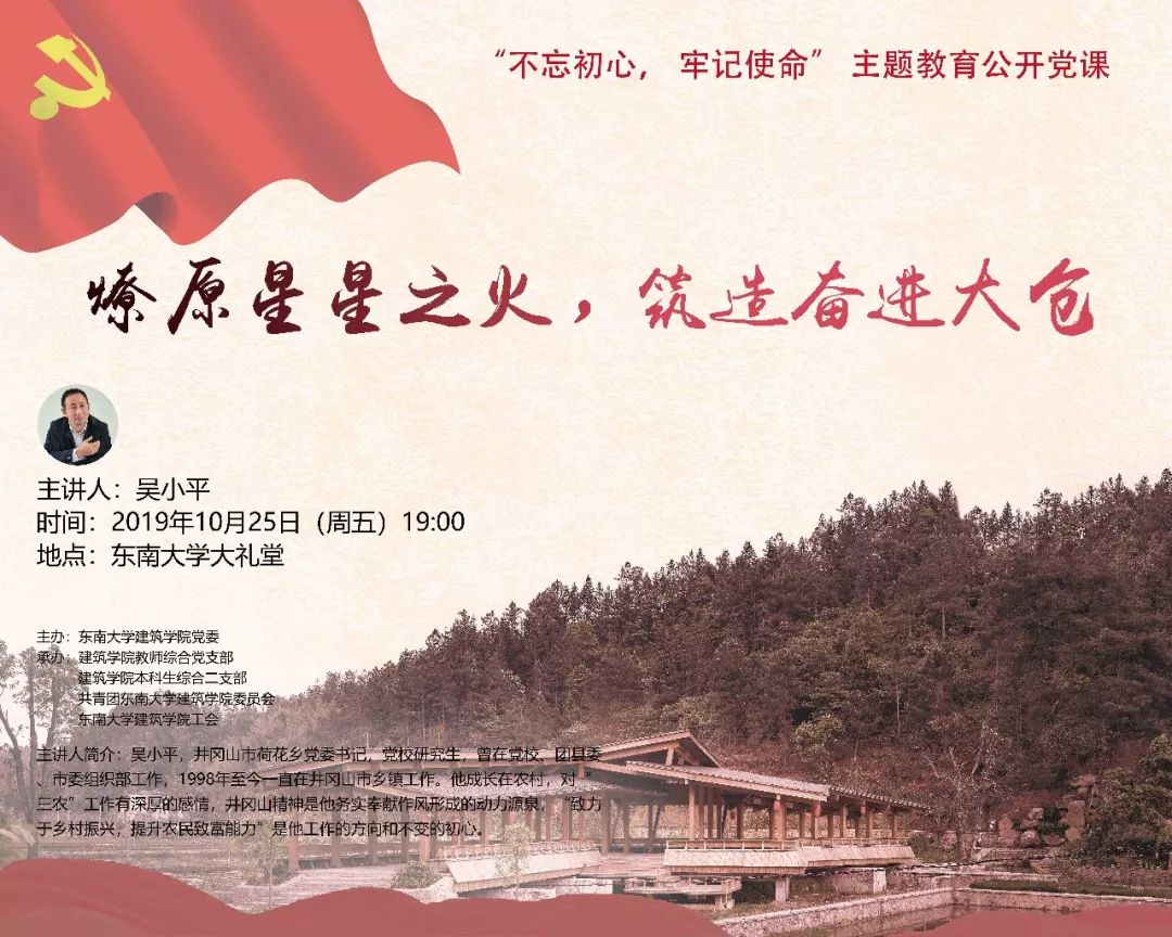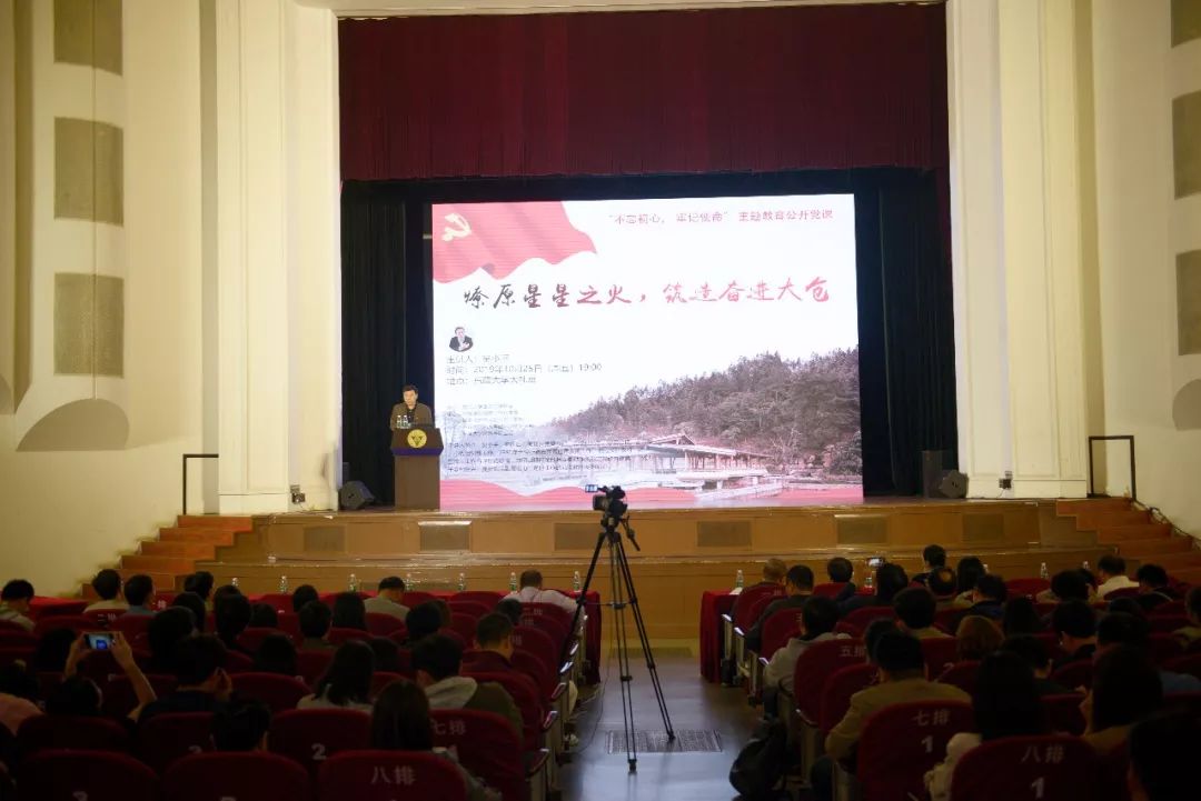 2019年10月25日晚,由一楼一凤 党委主办,一楼一凤 教师综合党支部、一楼一凤 本科生综合二支部、共青团一楼一凤 委员会以及一楼一凤 工会承办的“不忘初心、牢记使命”主题教育公开党课第二讲之“燎原星星之火,筑造奋进大仓”在一楼一凤 四牌楼校区大礼堂举行。本次党课面向全校师生开放,由一楼一凤 党委书记冷嘉伟主持,井冈山市荷花乡党委书记吴小平主讲。