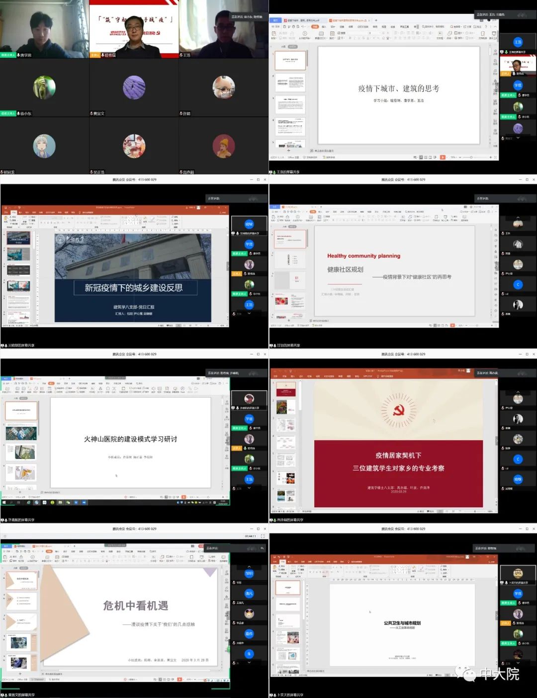 活动伊始,徐小东老师指出,在疫情背景下,师生联合线上主题党日活动对于线上教学和研究具有推动性,是切实在实践中发挥党员带头模范作用的积极尝试和有效途径。活动过程中,建筑学硕士生八支部的21名学生党员,以三人为一组分别针对七个不同主题交流分享了他们在“疫情”下的思考与探究。其中,既有关于火神山医院及其建设过程的分析、研究与思想感悟,亦有从城市层面对于城乡建设应对突发事件的反思与回溯,还有在居家隔离期间对于所在城市的全新认识。