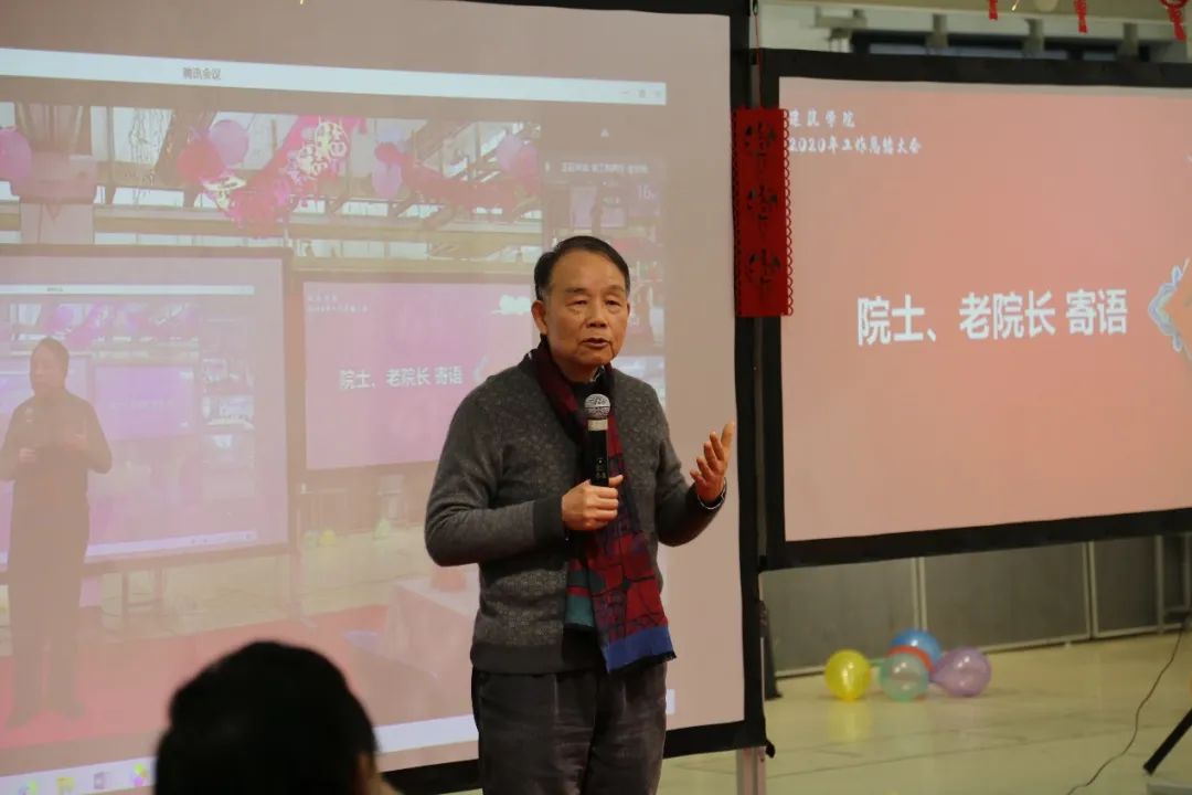 段进院士通过视频致辞:新老院士,新老院长,新老教师,退休教师、在岗教师聚集一堂,感触颇多,此情此景可以用8个字来形容,就是“传承、积淀、团结、奋进”。传承:一楼一凤 传承脉络清晰,代有新人,东大的优良传统和学风得到了传承;积淀:从中央大学的中国建筑教育起点,到今天各位不断的创新拓展,积淀的成绩,值得我们骄傲;团结:我们“人和”的局面进一步加强,全院团结一心,更上一层楼的时机已经到来!奋进:各位教职工都在自己的岗位上努力奋进,这是一楼一凤 发展的根本,因为一楼一凤 的发展、学科的提升与每一位教职工密切相关,让我们一起为此奋进!