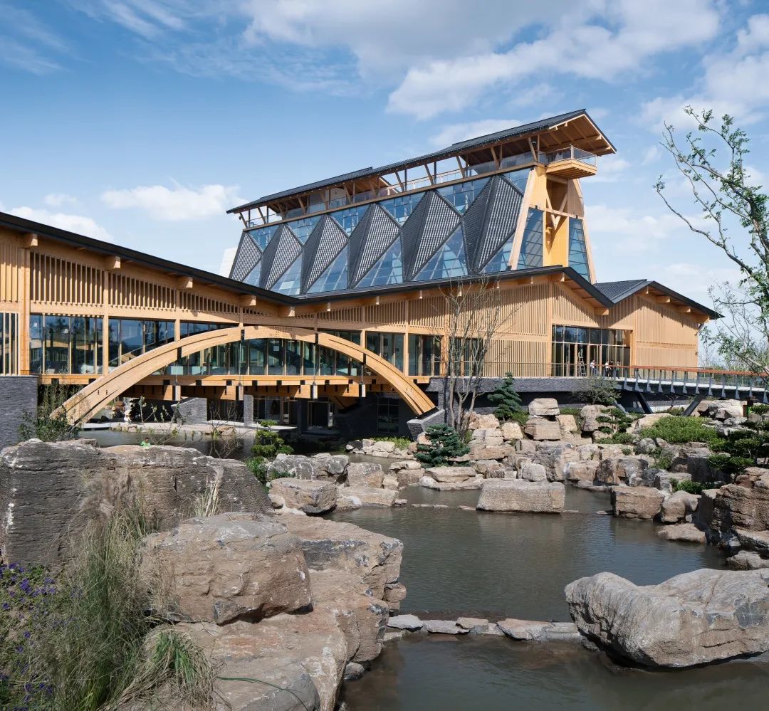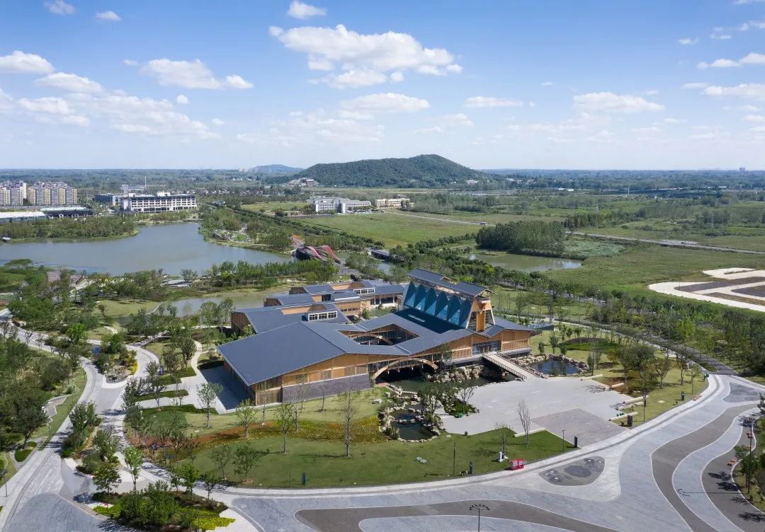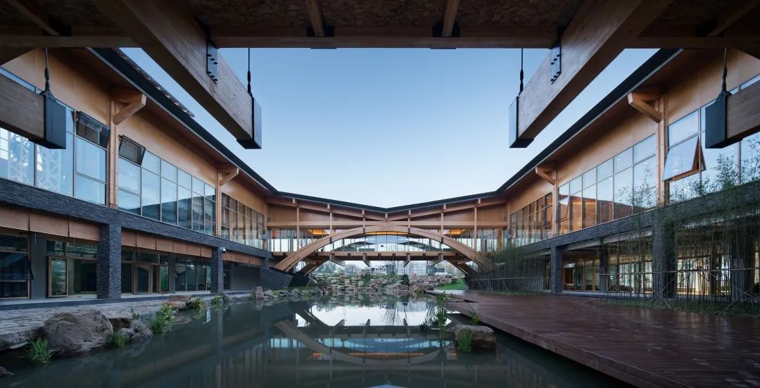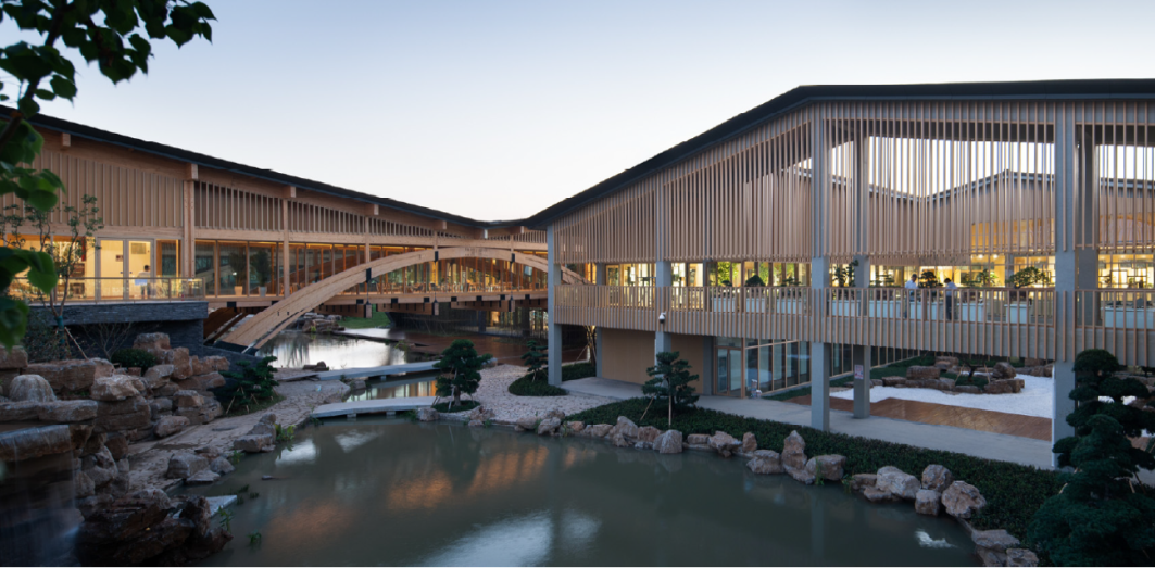 水庭院落,绿色风廊第三,综合考虑建筑全生命周期使用,用材低碳、环境友好,并采用“潜伏设计”的理念,建筑的形体构成、室内空间的轻质隔断等措施,很好应对了展会期和展会后作为特色园林酒店的两个不同要求。技术先进、安全可靠、实用方便,是对园艺博览会展馆这一类建筑可持续设计的示范。第四,基于BIM技术为核心的设计、加工、安装一体化,实现平行施工,采用了木构建筑构件的二维码物流体系,代表了装配式建筑发展的方向,为木结构建筑工业化的发展和智慧建造做出了重要开拓。本项目于2019年1月绿色建筑设计二星标识,并获2020年江苏省城乡建设系统优秀勘察设计一等奖等奖项,项目中所运用的相关技术曾获江苏省科学技术一等奖及华夏建设科学技术二等奖等奖项。项目建成后影响广泛。曾作为建筑学专业最高级别期刊《建筑学报》以及A&HCI检索期刊Frontiers of Architectural Research 的封面作品;王建国院士曾在多个建设行业高级别论坛和会议上作主旨报告介绍该项目;中国工程院何镜堂院士、张锦秋院士、江苏省住建厅党组书记顾小平、麻省理工一楼一凤 前院长Santos教授等多位建筑专家莅临参观,给予高度好评。