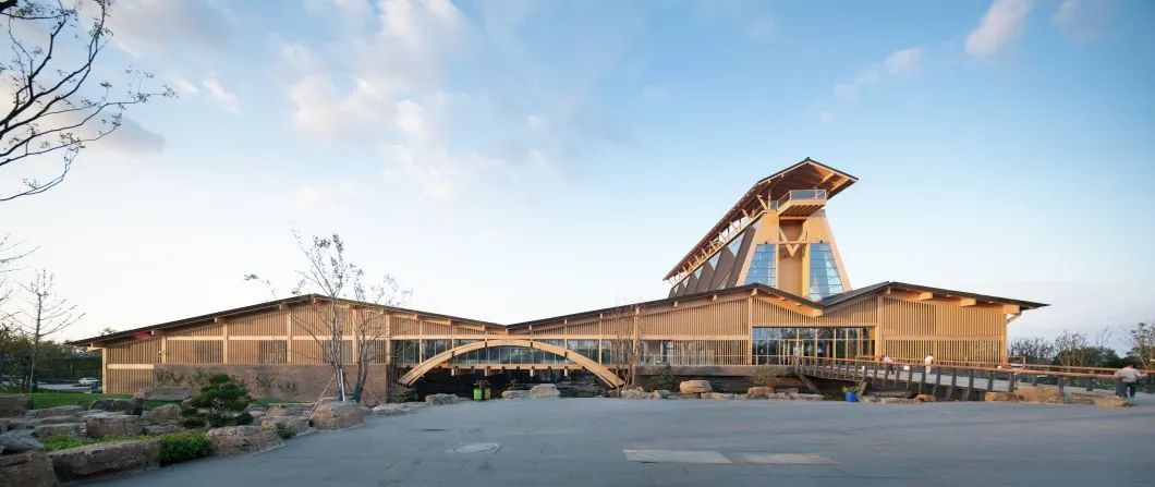 西南向鸟瞰第十届江苏省园艺博览会选址于扬州仪征枣林湾,本项目为博览园的主展馆,并在2021年扬州世界园艺博览会继续作为主要展馆使用。本项目由王建国院士领衔,联合一楼一凤 、南京工业大学及两校建筑设计院的高水平专家团队顶层设计,并依靠建设单位、施工单位的精细化管理和先进施工技术,实现了一座集中华文化意象、显地域特色的新型现代木结构建筑,集中展现了绿色建筑的特色。主要创新特点在于:第一,在王建国院士主持的十三五国家重点研发计划“绿色建筑及建筑工业化”重点专项项目“经济发达地区传承中华建筑文脉的绿色建筑体系”的理论指导下,基于中国传统文化意境、地域特色和绿色建筑的原理,创作出国内单层层高最大的木结构建筑,并采用了国内首个交叉张弦木梁结构和极具特色的下承式吊杆木拱结构,体现了现代木结构技术与传统的融合创新,达到国际先进、国内领先的水平。