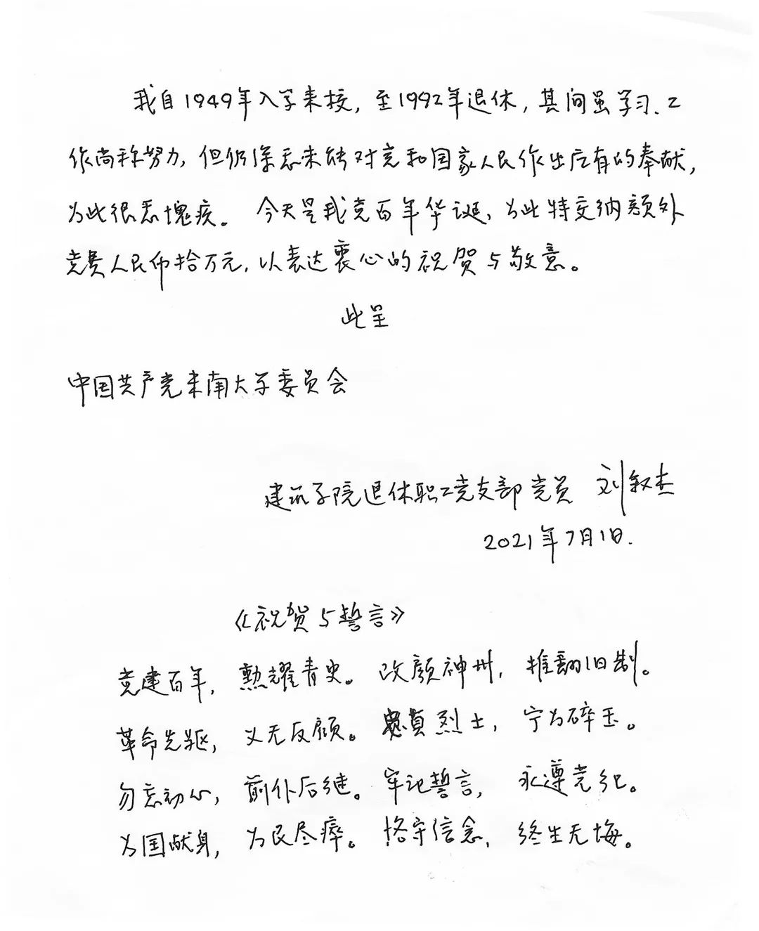 这笔党费,既是一位老党员发自内心对建党100周年的庆贺,也表达了刘老师对党的赤诚之心、感恩之情,祝伟大的中国共产党100岁生日快乐!