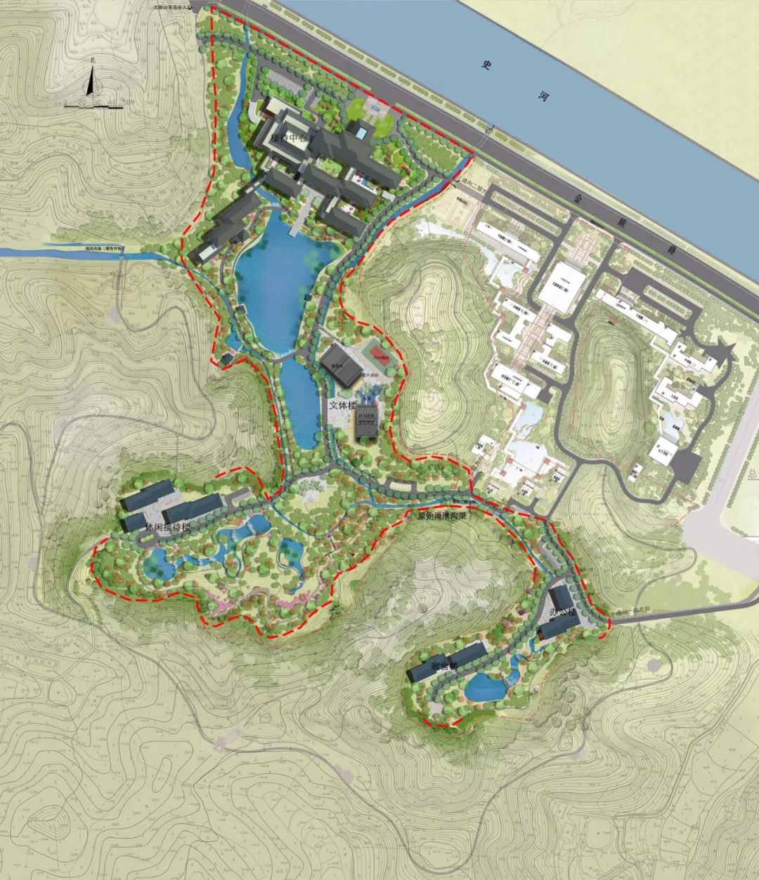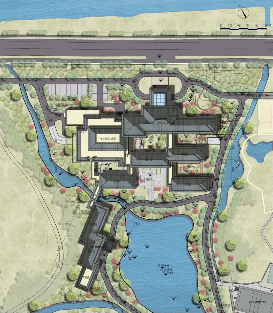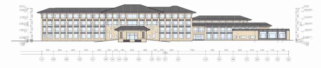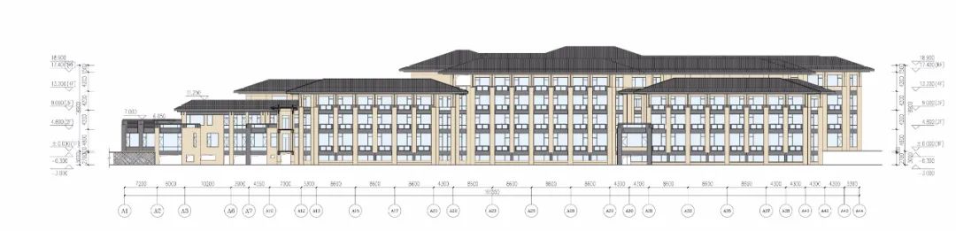 整体建筑设计方案设计协调统一,延续项目所在地的现有建筑的控制界面和组团肌理,同时利用环山道路有效连接干部一楼一凤 一期和二期形成环路,将山体纳入中心景观。项目规划与建筑设计都充分利用地形,将接待中心的大堂以及不同类型的客房、文体楼、后勤楼分组团置于不同现状环境的场地中,通过综合考虑组织内外交通,保证使用方便,互不干扰,便于建造,视野良好。建筑外形在设计上契合金寨干部一楼一凤 红色、革命、教育的主题,用庄重典雅的设计语言打造稳重开朗、开拓创新、与时俱进的建筑形象。