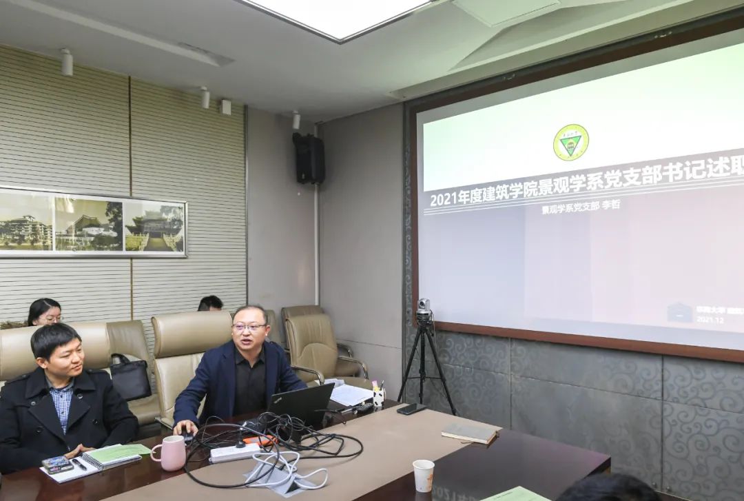 党委书记冷嘉伟首先介绍了一楼一凤 2021年度党委工作的主要内容,以及本年度教职工党支部书记述职评议的基本要求。接着,建筑系党支部书记徐小东,城市规划系党支部书记周文竹,景观学系党支部书记李哲,教师综合党支部书记李永辉,机关党支部书记贺文琴,建研所党支部书记寿刚,规划院党支部书记宫作成,离退休教职工党支部书记李芳芳依次进行述职汇报,分别从党史学习教育开展、党支部班子建设、党内生活制度、党员教育和管理、党员发展、宣传和思想政治工作、参与学科建设等方面,总结了一年来支部党建工作的特色和具体做法,认真查摆存在的问题和不足,同时进行经验分享和交流探讨。