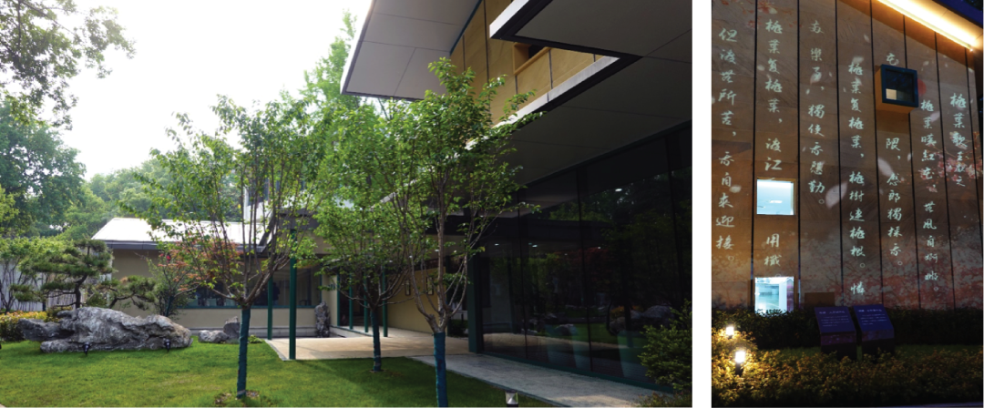 主厅、亭廊、浅池、花木、景石被精心组合于庭园之中,沿院墙走来,透过一个个窗格,一幅典雅画卷徐徐展开,一窗一景,步移景异。折向北行至入口,耳畔渐渐传来北侧景墙的潺潺水声,松树与卧石临于池馆的画面映入眼帘,与主厅大门上六朝古松相映成趣,仿佛将思绪带回千年文脉之中。待到黄昏灯起,诗文名句映现于建筑形成的“简牍”之上,恰似连通起古今文学情境。
