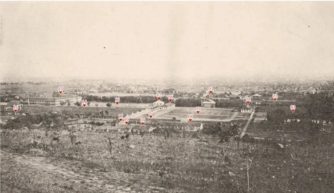 ▲南京高等师范学校西北向鸟瞰 01. 一字房02. 田字房05. 主操场06. 东操室13. 辅操场14. 平房寝室09. 发电室10. 储油室03. 教习房04. 西操室07. 工场及工匠寝室08. 工场及材料室15. 口字房16. 食 堂11. 厕 所12. 会宾厅
