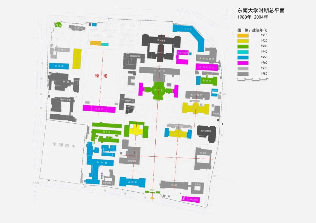 随着东南隅中学部的开工建设,主校门也东移至正对辅操场的附中西侧,直接开向四牌楼街,为远期现代大学校园的完整布局,留下了大有可为的前场空间。