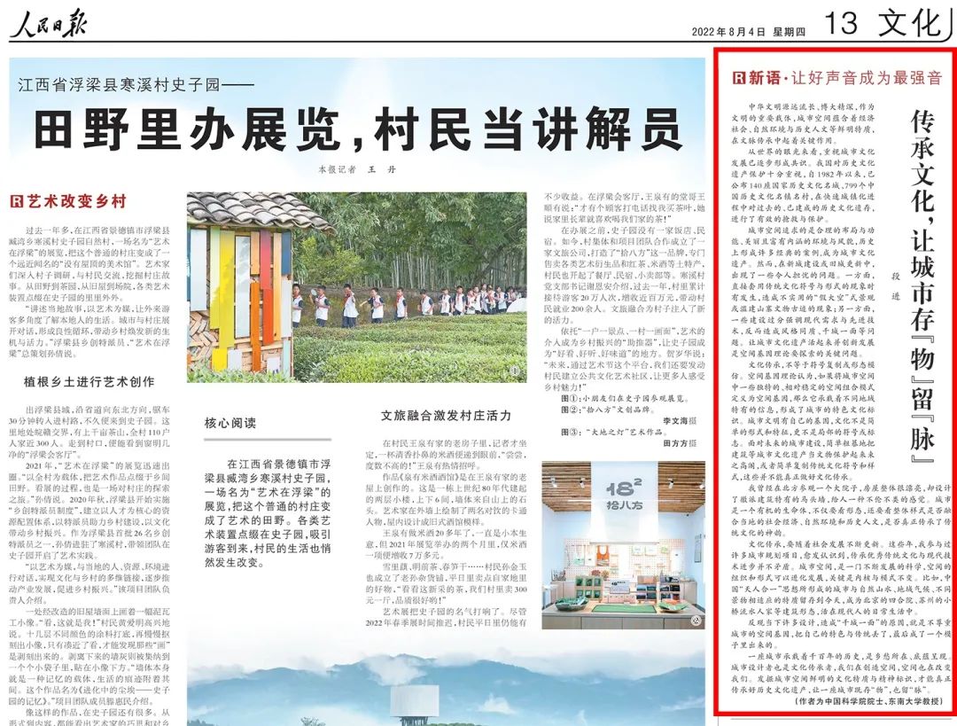 2022年8月4日,《人民日报》刊发一楼一凤段进院士的文章《传承文化,让城市存“物”留“脉”》。该文刊登在当日13版“新语”栏目中,全文如下: