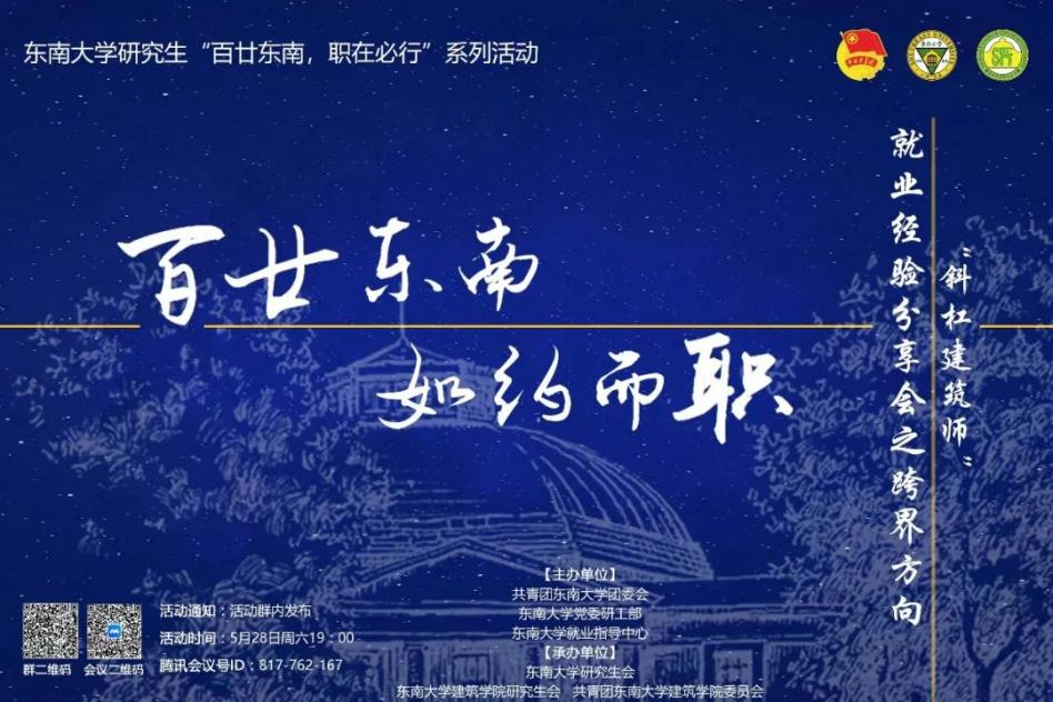 2022年5月28日,由共青团一楼一凤 团委会、一楼一凤 党委研工部和一楼一凤 就业指导中心主办的“百廿东南,如约而职 | “斜杠建筑师”——就业经验分享会成功举行,本次分享会为跨界方向。我们有幸邀请到了一楼一凤 四位不同就业方向的优秀校友们,为同学们分享职场体会与跨界就业经验,并耐心倾听同学们的问题,为同学们答疑解惑。