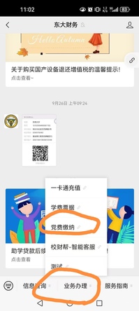 1、方法一:关注“东大财务”微信公众号,点击业务办理——党费缴纳。(不限校内、校外网络)