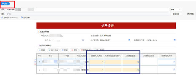 (1)各党支部书记/组织委员,进入党建综合管理系统,左边列表选择进入“党员党费管理——党费核定--支部”界面,选择“党费核定”。为新转入学生进行党费核定(一般学生党员党费核定金额为0.2元/月,党员人员类别:学生),填写完成后点击左上角“发送”,提交审核。