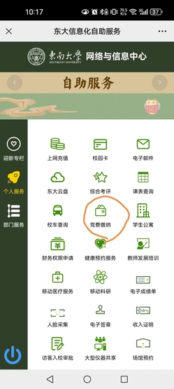 2、方法二:关注“东大信息化”微信公众号,点击右下角“自助服务”模板,选择自助服务——个人服务——党费缴纳。(不限校内、校外网络)