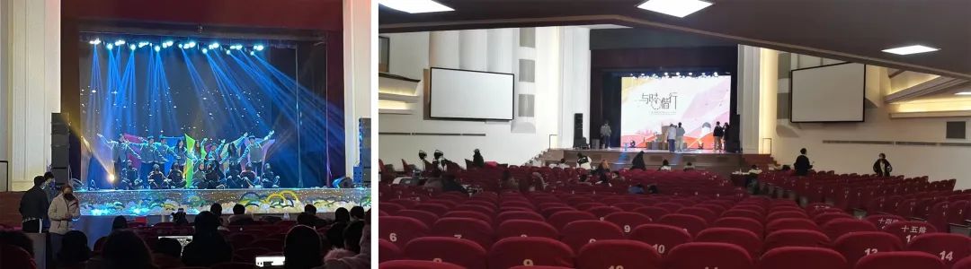 出于疫情防控考虑,本次建筑之春文艺晚会采用录播方式进行,然而寒意难抵此夜大礼堂的灯火明媚,这里持续散发温情与活力,许多人忙碌的身影点缀其中。此时,前厅装点一新而不显落寞,一场欢快的盛宴即将开启。