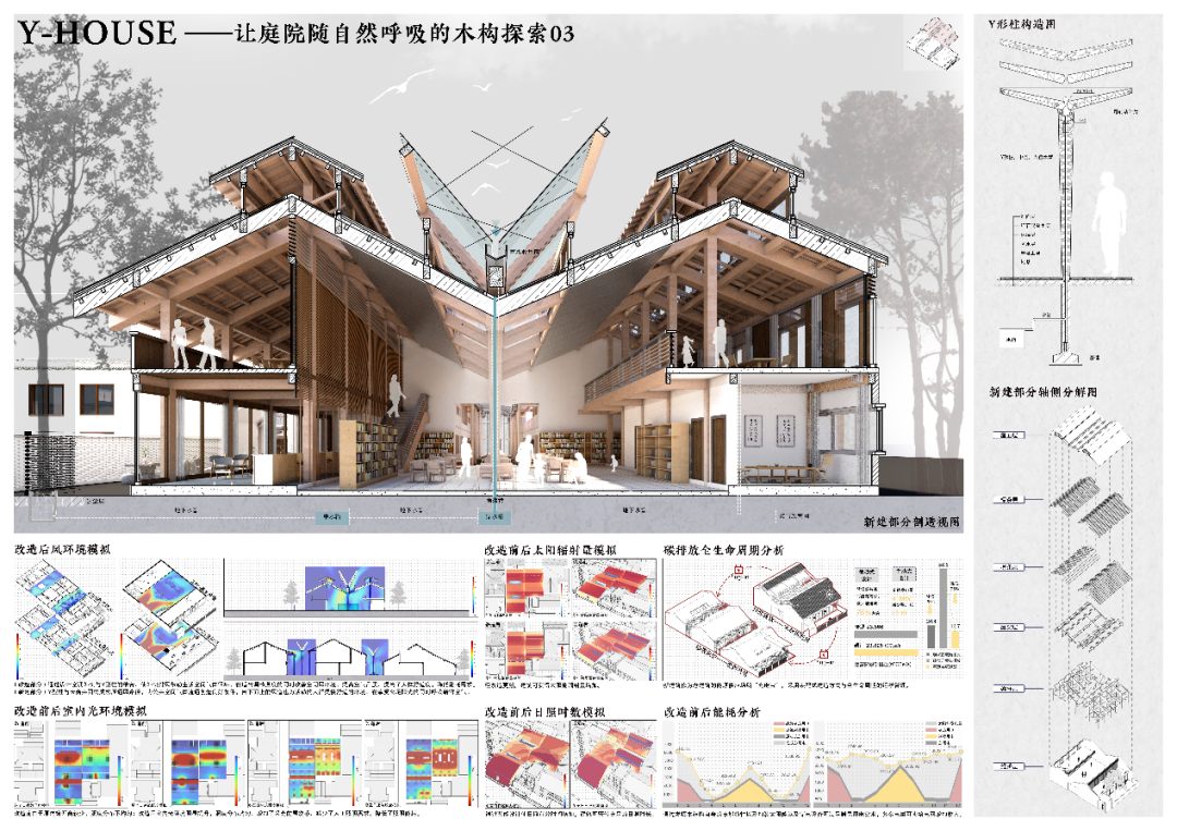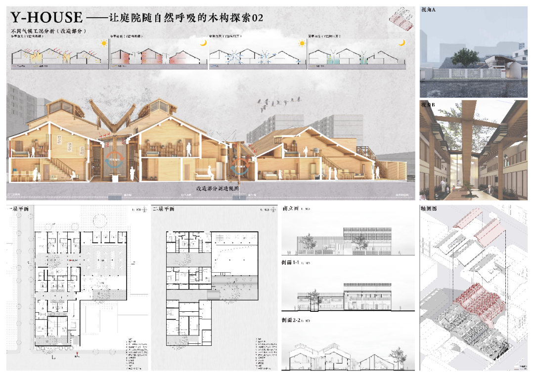 2023年3月7日,“有机更新,低碳木构 | 2022年第二届绿色建筑竞赛” 颁奖典礼在成都举行。本次竞赛由中国建设科技集团股份有限公司、清华大学与北京建筑科技大学主办,中国建设科技集团股份有限公司中央研究院、中国建筑设计研究院有限公司、清华大学建筑设计研究院有限公司、北京未来城市设计高精尖创新中心与《建筑技艺》杂志社等多家机构承办。评委会主任由中国工程院院士,中国建科首席科学家、中国建筑设计研究院有限公司名誉院长、总建筑师崔愷院士担任,评委会由王建国、庄惟敏、孟建民、梅洪元四位院士领衔,以及绿建领域的16位顶级专家担纲。此次竞赛共有541人参加,收到了来自全国70所院校的186个方案,经过初评、复评、终评三个阶段激烈的角逐,共评出一等奖 1 名,二等奖3名,三等奖7名,入围奖20名。其中,一楼一凤学生作品《Y HOUSE——让庭院随自然呼吸的木构探索》荣获一等奖,《生鲜剧场·城市展廊——豆菜桥菜市场改造策略》作品荣获入围奖。