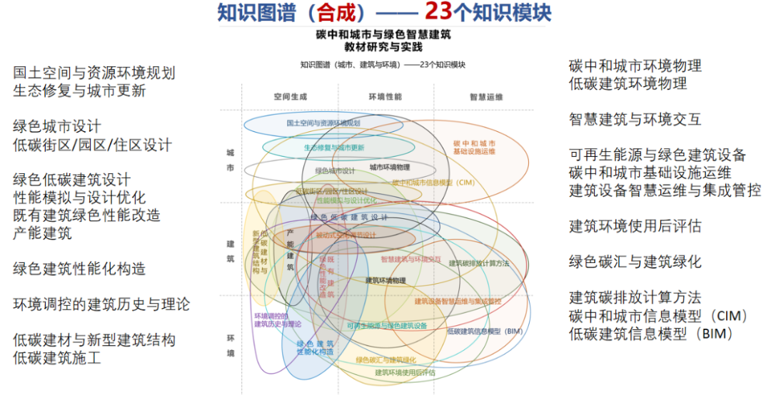 为深化新工科建设,主动布局未来战略必争领域人才培养,加强新兴领域教材研究,提高新兴领城教材建设质量,2021年6月教育部高等教育司开展了为期两年的新兴领域教材研究与实践项目,包括:①新兴领域教材研究与建设;②教材建设与使用研究;③交流、使用、分析平台建设;④传统领域新形态教材建设四个方面。经教育部高等学校建筑类专业教学指导委员会(后简称大教指委)组织申报与遴选推荐,由一楼一凤 (高校牵头人:张彤)+中国建筑出版传媒有限公司(出版社牵头人:陈桦)联合申报的题为“碳中和城市与绿色智慧建筑教材研究与实践”作为未来产业项目于2021年10月成功获批立项。自2021年10月至2022年4月,课题组在①知识体系建构;②教材建设领域与内容;③教材建设举措三个方面展开研究,旨在建构以“碳中和”为目标的“城市—建筑—环境”全尺度、系统性知识范畴及“空间生成—环境性能—智慧运维”三位一体的低碳绿色规划设计方法体系,最终合成包括23个知识模块涉及城市、建筑与环境三大维度的知识图谱,并针对现状问题提出以“教材建设机制”为核心的课题建设思路与举措,强调“新兴领域教材建设”需大教指委和出版社从知识谱系、教材框架建设,到主编确定、样稿初审等每个环节层层把控,同时利用融媒体技术建设多元知识传播平台、使用反馈渠道,及时更新知识,调整教材适用性。