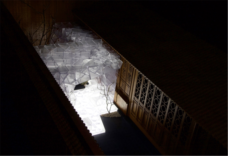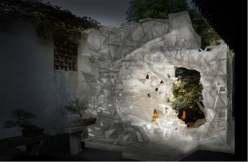 作品提取中国古典园林中的典型视觉母题——“冰裂纹”,借助智能算法和数字生成,将二维的传统图案衍化为三维的立体构成,进而在网师园东隅“云窟”边院的尽端,与山石花木为伍,用透明材质构筑起一处“轻云窟”,作为原有茶室的延展,在这个失去重量、尽显碎裂的世界里,营造一处撷云之根、归隐内心的固着场所。
