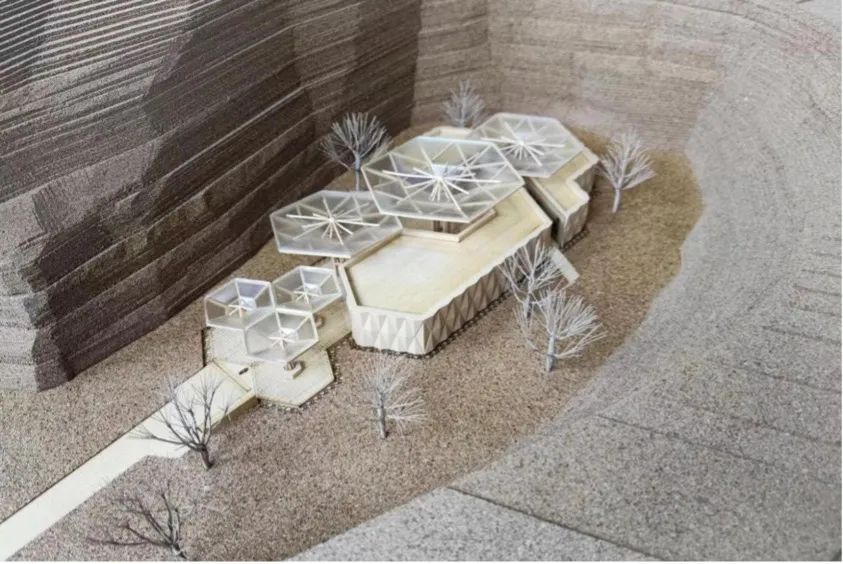 作品二“矿坑游客中心”:基于“庇护”的理念,空间的顶为七座大小不一的胶合竹伞构筑物,为游客的活动提供挡风遮雨场所的同时又与环境充分融合。胶合竹伞主要由伞冠、伞茎、基座三部分组成,直径从7米到19米不等,高度上错落有致,覆盖在人群活动区域的上方,相互交错重叠,仿佛大自然中的一丛菌冠。原本一览无余的矿坑被营造出了一种野趣而丰富的空间序列,游客在尺度上模拟了昆虫的视角,重新唤起了对自然的敬畏。