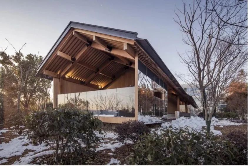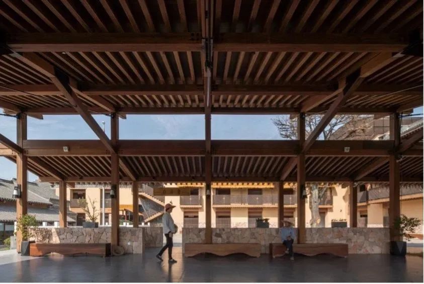 作品三“乡村公共空间复兴”:项目将原有村委三层办公楼进行改扩建,形成乡村旅舍的客房,围合出的内院保留了原场所记忆,成为村民和游客日常活动的乡村小广场。胶合竹材与钢构件的组合运用,实现了小尺寸结构杆件在乡村建设条件下的安装可实施性,并利用小尺寸结构构件形成室内大空间以供村民和游客使用。设计探索了在中国城市近郊乡村中既实现了乡村建设的现代化、又不抹杀乡村的文化特征的公共空间营造方式。