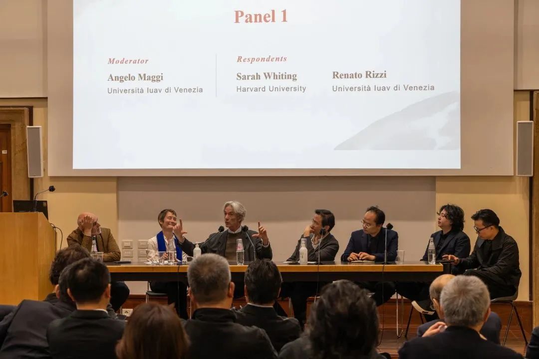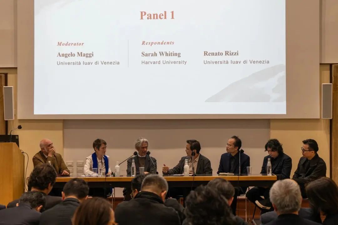 讨论环节,哈佛设计一楼一凤 (GSD)院长 Sarah Whiting 和威尼斯建筑大学教授 Renato Rizzi 对建筑更新叙事中的时间概念展开了讨论。Sarah 教授指出了时间的两种类型,一是渐进发展的线性时间经验,另一种是以具体事件、记忆为载体的节点式时间体验。Rizzi 教授则指出,时间是我们理解过去、现在乃至未来的认知基础。在讨论中,张彤教授指出了东西方建造文化中对待时间的认知差异,西方的砖石建造体现了建筑对时间作用的抵抗,相反,东方木构建造的灵活与自适则体现了容纳时间的营造智慧。