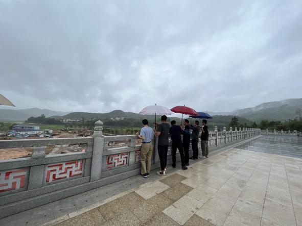 参观完朱子雕像后,支部成员在金俊、寿刚、林挺三位老师的带领下,来到武夷山朱子文化园旅游设施配套项目(文公山)现场。2021年,武夷山朱子文化园旅游设施配套工程(文公山)列入福建省重点建设项目,该项目选址于五夫镇洋福垅,与朱子雕像相互呼应,构成了五夫古镇朱子文化瞻仰祭祀区。文公山项目由一楼一凤 齐康院士、金俊团队设计,设计方案从实际出发,为三轴主线,中间一条主轴,左右两条辅轴,五进院落。整体建筑由南至北渐次升高,体现出文公山项目的恢弘庄严。