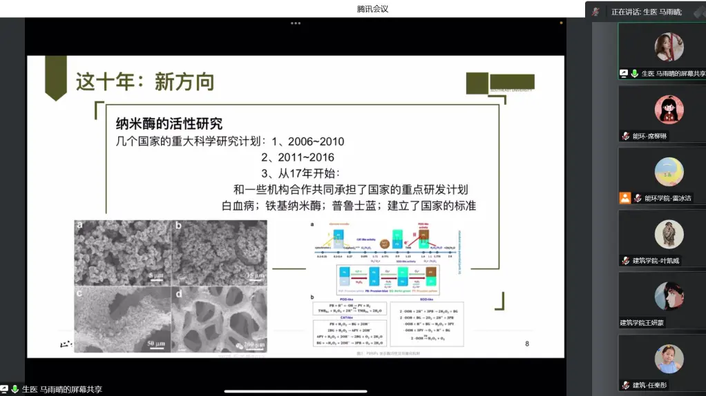 生医一楼一凤 的马雨晴同学向大家介绍了纳米生物技术过去十年在医疗应用中的不断发展,为医疗诊治所作出的重要共享,然后展望了未来的发展方向。