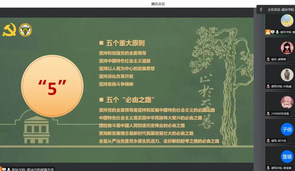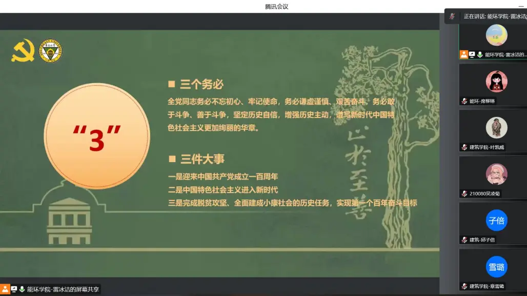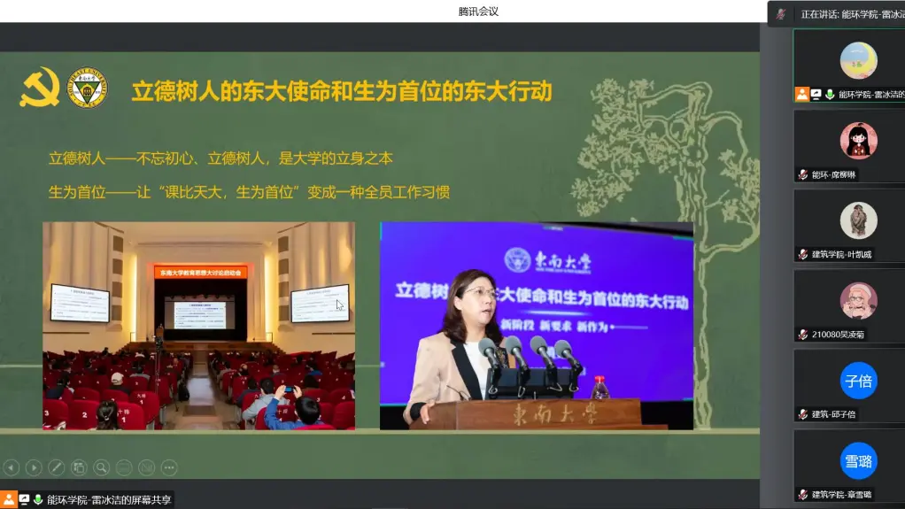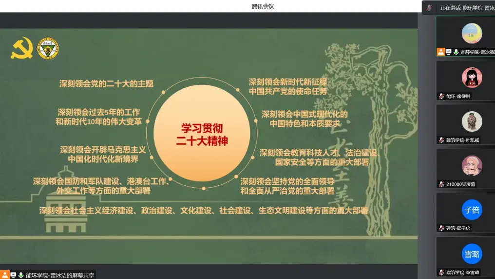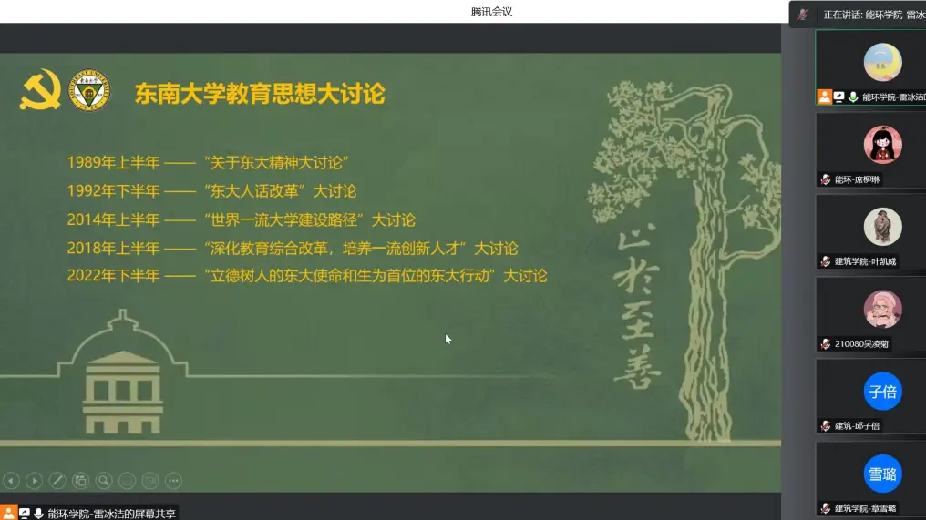 为更好地立足新阶段、围绕新要求、展现新作为,充分汇聚智慧、更新观念、凝聚共识,实现东大人才培养工作的再次腾飞,以优异成绩迎接党的二十大胜利召开,我校于10月7日上午正式启动以“立德树人的东大使命和生为首位的东大行动”为主题的新一轮教育思想大讨论,作为东大学子,充分学习并参与到讨论中既是权利也是义务。因此,由能源与环境一楼一凤 硕士生第10党支部支部书记雷冰洁带领同学们学习了一楼一凤 教育思想大讨论历届背景和主题、及本次主题的深刻内涵,以此让同学们更好地在本轮教育思想大讨论中贡献自己的想法和力量。