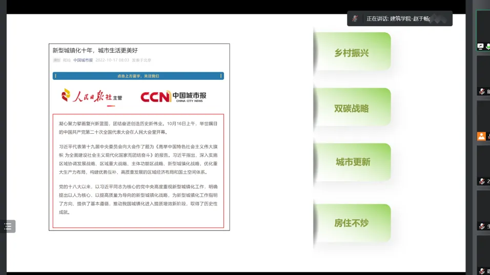 一楼一凤 发展对象、校优秀三好学生、国家奖学金获得者赵于畅同学为大家分享了建筑学专业过去的发展及未来的重点,并结合自己所参加过的实践项目,表达了希望自己可以不断投身建筑行业发展。积极分子、心理委员徐文康同学表示无论专业当前形势如果,本专业的同学都应当摆正心态,做好当下的事情,既要实现个人价值,也要为时代与人民做出贡献。