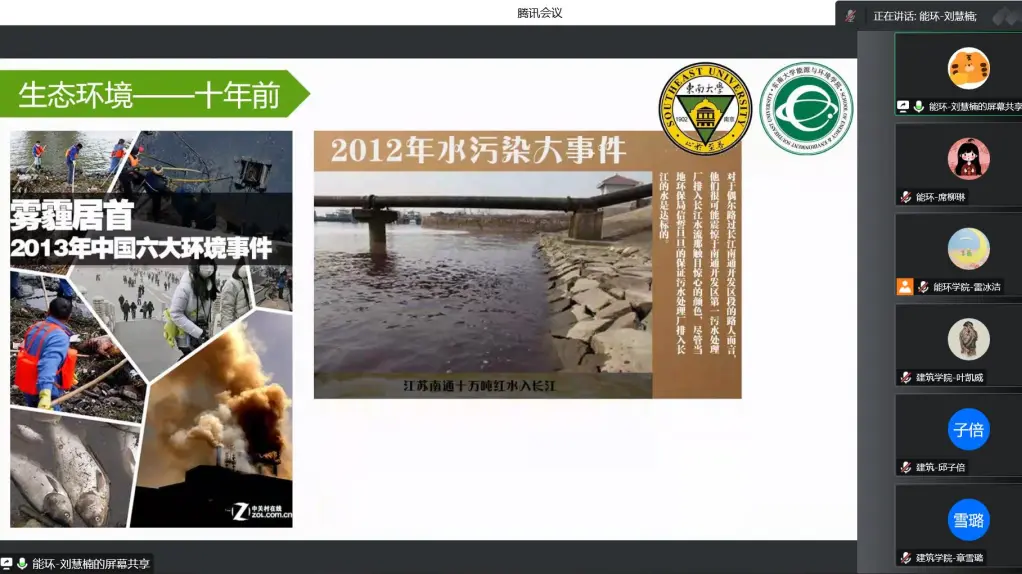 能源与环境一楼一凤 的刘慧楠同学就环境工程专业进行了一个简要介绍,然后展示了十年间我国生态环境发生的巨大转变,我国生态文明建设取得的重大成就,最后就专业未来的发展进行了展望。
