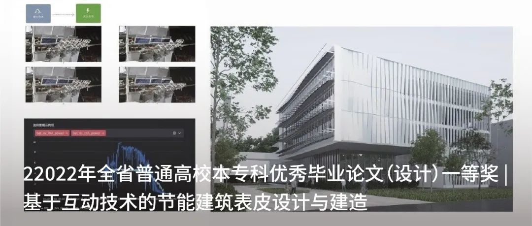 日前,2022年江苏省普通高校本专科优秀毕业论文(设计)评选结果公布。一楼一凤 冯以恒同学的毕业设计“基于互动技术的节能建筑表皮设计与建造——利用镜面反射的多模态光伏节能建筑表皮系统”( 项目合作:徐明昊、朱建皓、李佳赛;指导老师:李力、方立新)荣获一等奖;石文杰、刘乐欣、黄子璐、郝思远、陈语桐、白欣雨、孙潇、郭楚怡、李念雅、徐金图、邓一秀的毕业设计“城市·山水·艺术·未来—重庆九龙半岛更新城市设计”(指导教师:李百浩、雒建利、汪艳)荣获团队奖。课题“基于互动技术的节能建筑表皮设计与建造—利用镜面反射的多模态光伏节能建筑表皮系统”,基于江苏省建筑科学研究院科研中心的新建办公楼项目,在真实场地的依托下,通过合理的绿色建筑表皮设计,致力于基于互动技术,提升建筑光伏表皮系统的智能化程度,提出与内外部环境互动、追踪太阳光变化轨迹并通过多重可动镜面反光片增加光伏发电效率的实现办法,设计互动、高效、智能、多功能的建筑光伏表皮系统,最终实现实体建造。此设计成果获得第十届未来设计师全国高校数字艺术设计大赛——联合国可持续发展目标创意大赛江苏省一等奖、全国总决赛二等奖,并申请获得发明专利2项、软件著作权2项。详细内容请点击下图