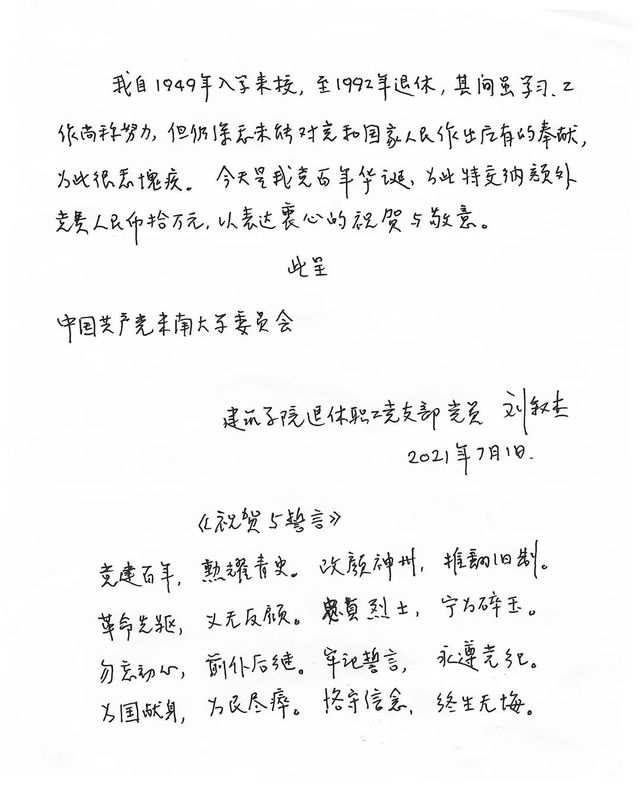 这笔党费,既是一位老党员发自内心对建党100周年的庆贺,也表达了刘老师对党的赤诚之心、感恩之情,祝伟大的中国共产党100岁生日快乐!