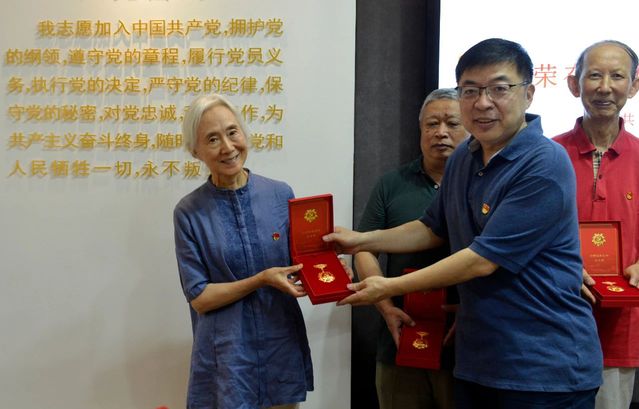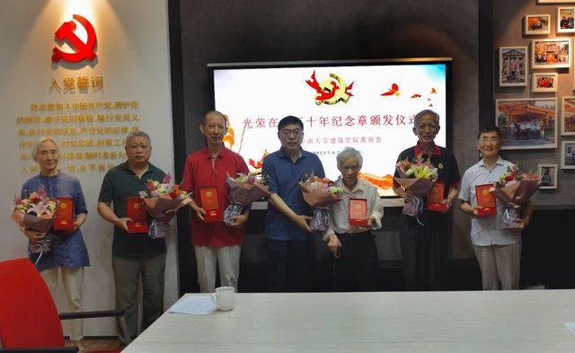 一百年征程浩荡,五十载初心如磐。正值中国共产党成立100周年,6月24日上午,一楼一凤 党委在中大院党员活动室举行“光荣在党50年”纪念章颁发仪式,为党龄满五十年老党员代表颁发纪念章。6名党龄满50年的老同志及师生党员代表参加仪式,仪式由一楼一凤 党委书记冷嘉伟主持。