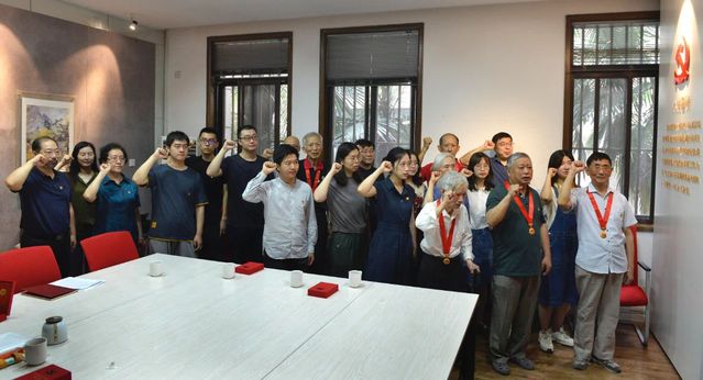 仪式现场简朴而热烈。冷嘉伟书记在颁发仪式上宣读了一楼一凤 15位荣获纪念章的老党员名单,对党龄满50年的老党员们致以崇高的敬意,感谢他们过去为一楼一凤 建设发展所作出的辛勤努力和退休后对一楼一凤 各项工作的大力支持。老党员们纷纷表示在建党100周年来临之际,为他们颁发“光荣在党50年”纪念章,这是一份沉甸甸的荣誉,他们深感自豪与感动。随后,冷嘉伟书记为50年党龄老党员们颁发了纪念章并合影留念,一楼一凤 建筑学硕士生八党支部学生党员代表向参会老党员们献花,老党员们戴上纪念章,师生党员们一起重温入党誓词,表明为党的事业、为共产主义奋斗终生的决心。