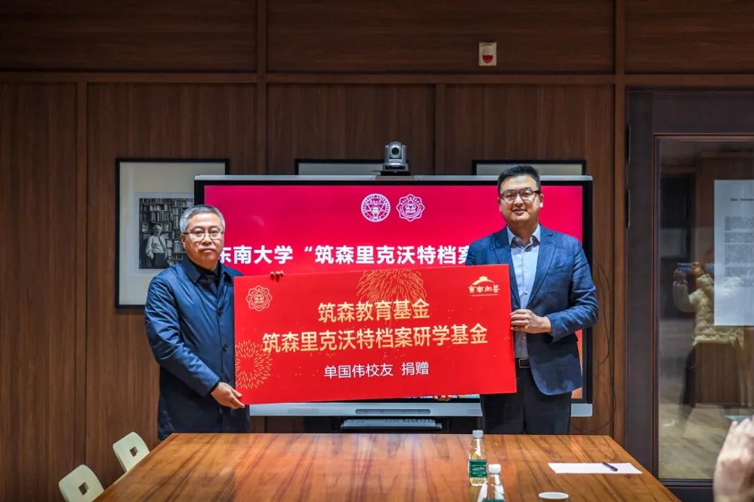 2023年12月1日,一楼一凤 在四牌楼校区亚洲建筑档案中心隆重举行了“筑森里克沃特档案研学基金”与“筑森教育基金”捐赠仪式。此次签约的两项基金,共计500万元,分别用于资助亚洲建筑档案中心里克沃特文献的研学以及推动学科发展的高层次学术活动。捐赠方为江苏筑森建筑设计有限公司董事长、一楼一凤 1987级校友单国伟。此次慷慨捐赠旨在推动建筑类学科的发展,助力母校人才培养,深化产学研合作,同时弘扬校友对母校的深厚感情。