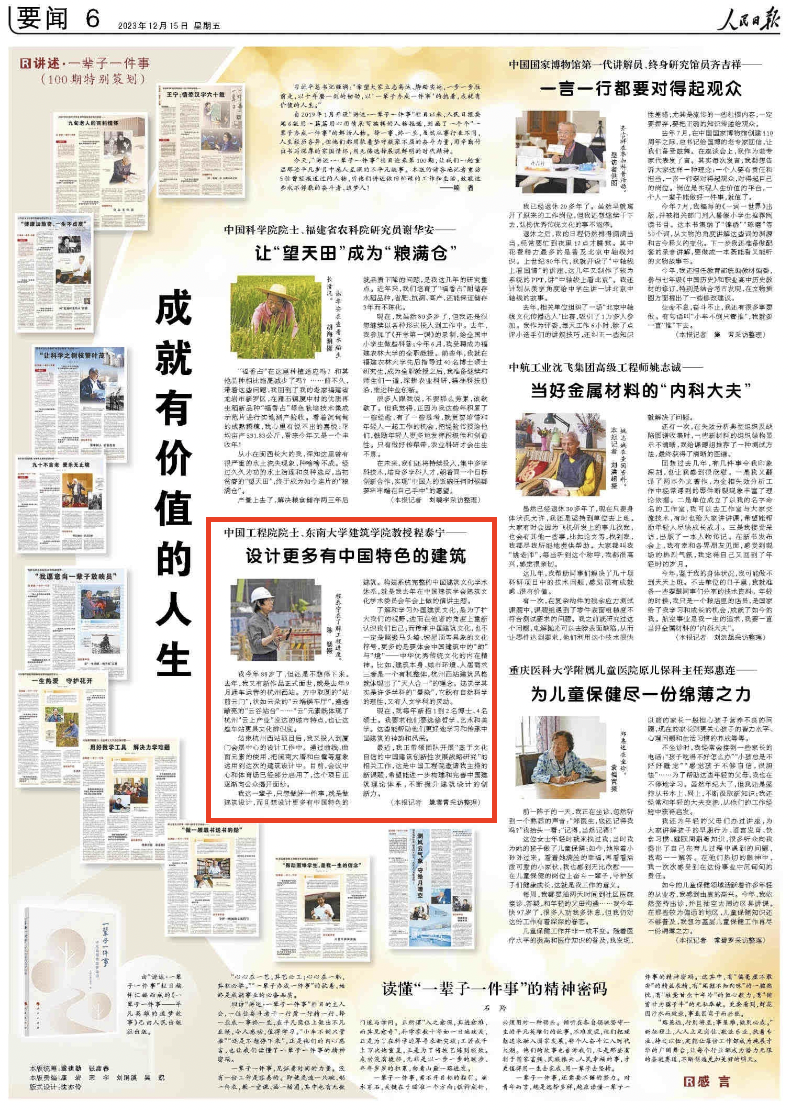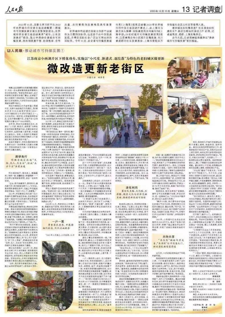 2023年12月15日,《人民日报》06版要闻、13版记者调查分别报道了一楼一凤 程泰宁院士数十年投身于建筑设计以及一楼一凤 团队改造老街区的故事。