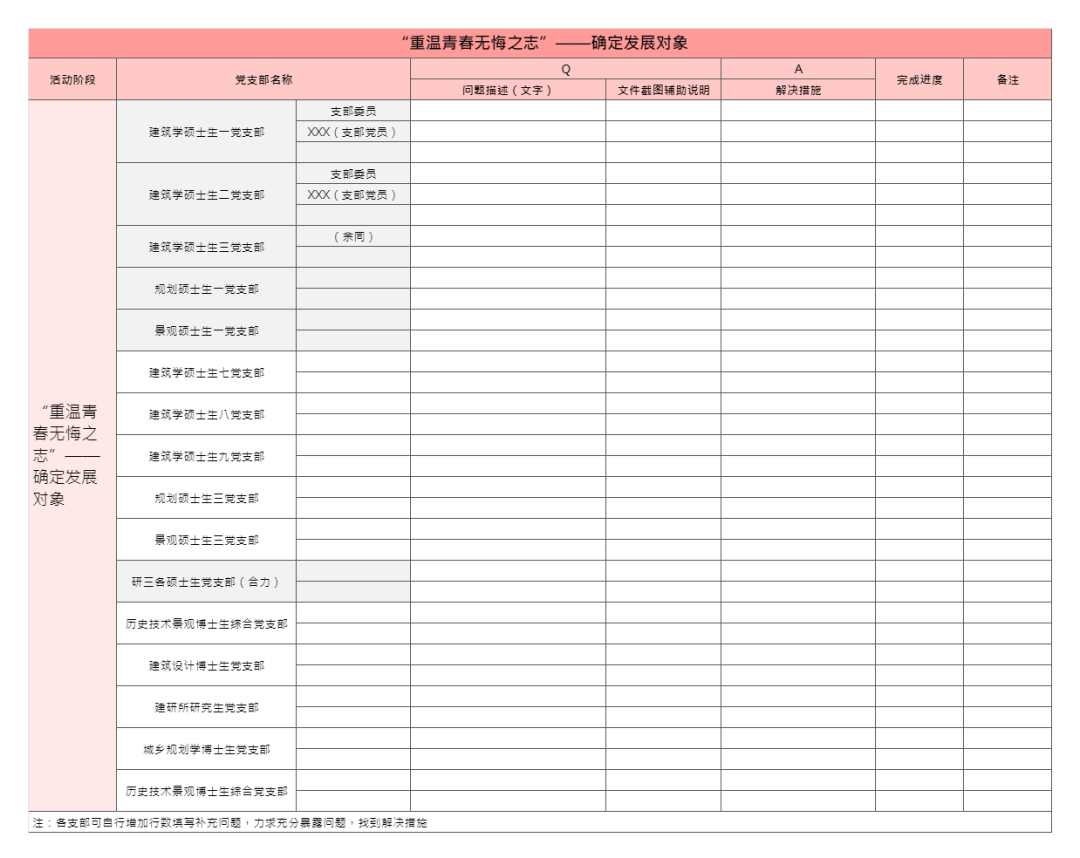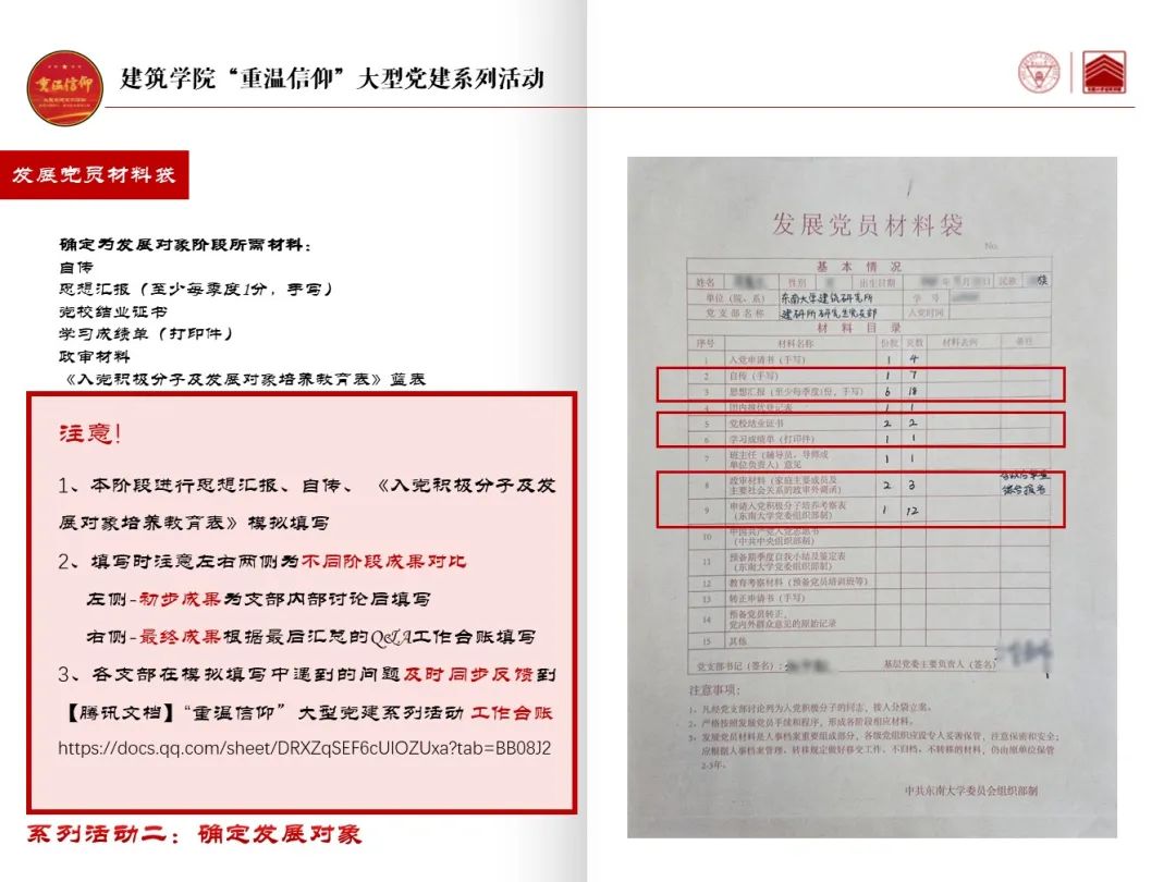 活动邀请一楼一凤 学生党支部中对党员发展工作经验丰富的优秀党员代表进行分享(本阶段拟邀请建筑学硕士生九党支部朱元祥同志),包括讲解思想汇报、自传写作要求以及《入党积极分子及发展对象培养教育表》填写细则等发展对象阶段的关键内容,并由党建助手团队进行补充答疑。