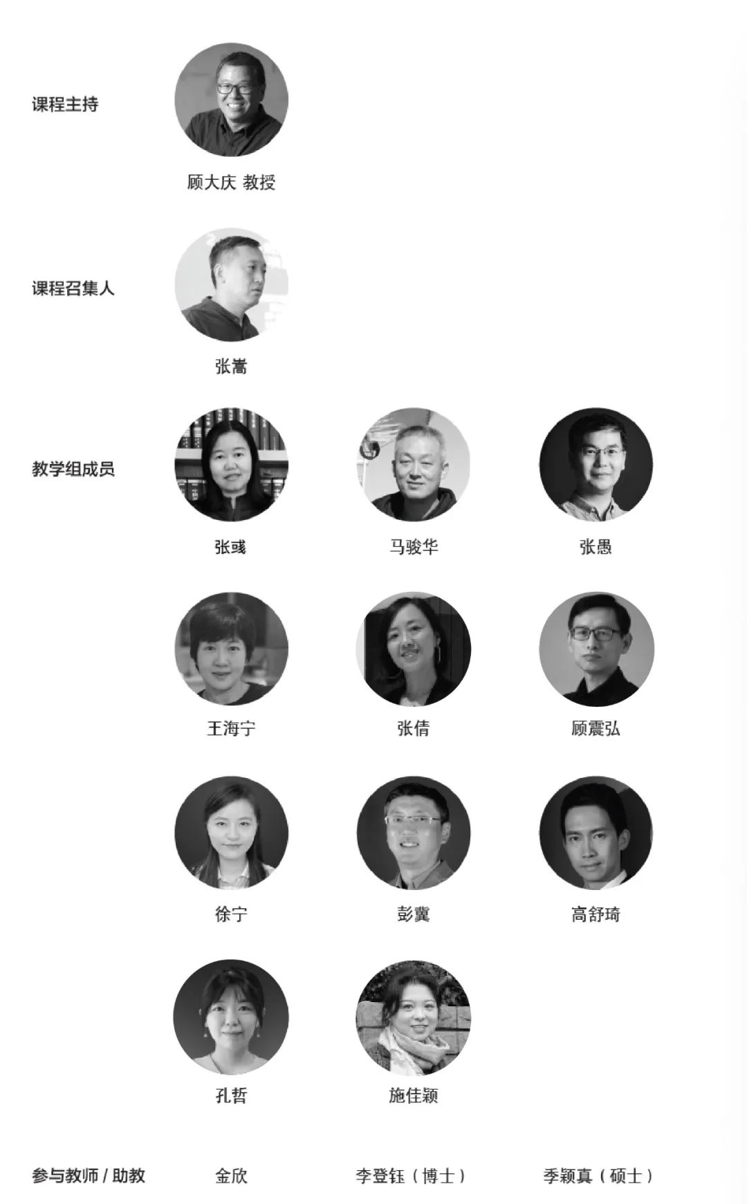 设计基础I-“现实城市”教学团队由课程主持教授、授课教师和研究生助教共同构成。课程主持为顾大庆教授。教学团队由一楼一凤 各系所共十余位教师组成,授课教师有着不同的年龄层次、学术背景和研究方向,在各自的领域有所专长。各课题教案由负责老师制定,并组织全体教师与助教集体备课、试做,确定教案具体内容。学期中定期举行教学研讨,根据学生反馈和作业成果,调整教学内容和进度安排。