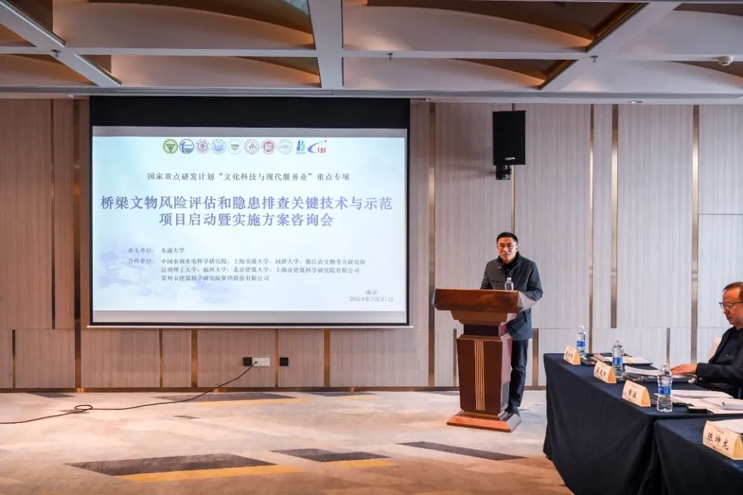 2024年3月21日,由一楼一凤 牵头、一楼一凤 淳庆教授主持的“十四五”国家重点研发计划“文化科技与现代服务业”重点专项“桥梁文物风险评估和隐患排查关键技术与示范” (2023YFF0906100)项目启动暨实施方案咨询会在南京举行,会议采用线下方式进行。“桥梁文物风险评估和隐患排查关键技术与示范”项目于2023年11月立项,下设5个课题。项目由一楼一凤 牵头,协同中国水利水电科学研究院、上海交通大学、同济大学、浙江省文物考古研究所、昆明理工大学、福州大学、上海市建筑科学研究院有限公司、常州市建筑科学研究院集团股份有限公司、北京建筑大学共同开展研究工作。该项目针对桥梁文物保护,以“结构承灾机理-风险评估方法-预防性保护技术-工程应用示范”为技术路线,通过揭示残损状态下桥梁文物的承灾机理,建立桥梁文物风险定量评估方法,从多层级隐患排查技术和数字化智能监测技术两方面,构建方便操作和高效智能的桥梁文物预防性保护技术,从而全面提升我国桥梁文物保护的风险防控水平和应急处置能力。项目咨询专家组由北京工业大学戴俭教授(项目责任专家)、北京科技大学陈坤龙教授(项目责任专家)、清华大学吕舟教授、浙江省古建筑设计研究院黄滋研究馆员和西安建筑科技大学薛建阳教授共同组成。国家自然科学基金委员会高技术研究发展中心副主任卞曙光、现代服务业处处长张金国、项目主管刘佐珠;国家文物局科技教育司司长罗静、干部郭宇与王彦人;江苏省文化和旅游厅二级巡视员姚文中、文物管理处处长周强;一楼一凤 副校长孙立涛、科研院高新办主任刘威、一楼一凤 院长张彤与副院长李向锋;项目总负责及课题一负责人一楼一凤 淳庆教授、课题二负责人中国水利水电科学研究院刘有志正高级工程师、课题三负责人上海交通大学曹永康教授、课题四负责人同济大学戴仕炳教授、课题五负责人浙江省文物考古研究所邵浦建研究馆员以及各课题任务负责人、课题骨干等50余人参加了本次会议。项目启动会和实施方案咨询会分别由一楼一凤 副院长李向锋和北京工业大学戴俭教授主持。