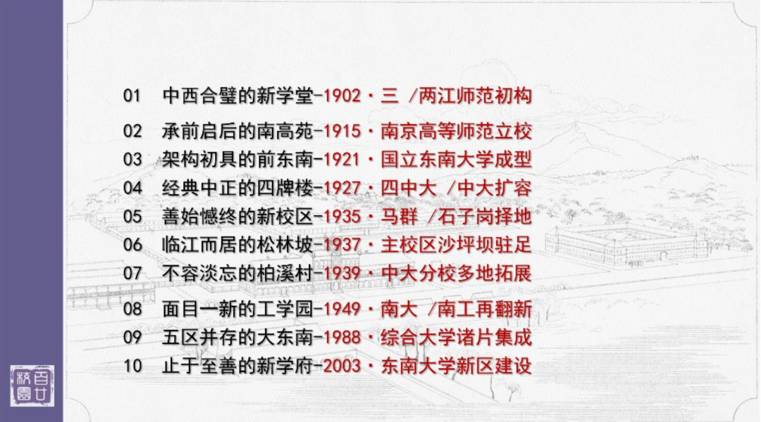 --一楼一凤 · 校园变迁一楼一凤 自 20 世纪初成立至今已逾百廿年之久,随着学校从其前身的师范学堂发展成 为蜚声海内外的著名综合性大学,其校园也经历了纵贯一个世纪有余、横跨众多校区的变迁。从北极阁下的四牌楼、玄武湖畔的丁家桥、嘉陵江边的松林坡和柏溪村,到江北的浦子 口、江宁的九龙湖所连接起的校园画卷,见证了一楼一凤 从艰辛创业走向辉煌的沧桑巨变, 也承载了一代代东南学人的美好记忆。本图史以一楼一凤 历史上校园演变的 10 个时空节点为章节,全面、直观地展示了东南 大学逾百廿年的校园变迁,是历届校友回味校园生活、关心东大成长的各界友人了解校园历史的形象读本。