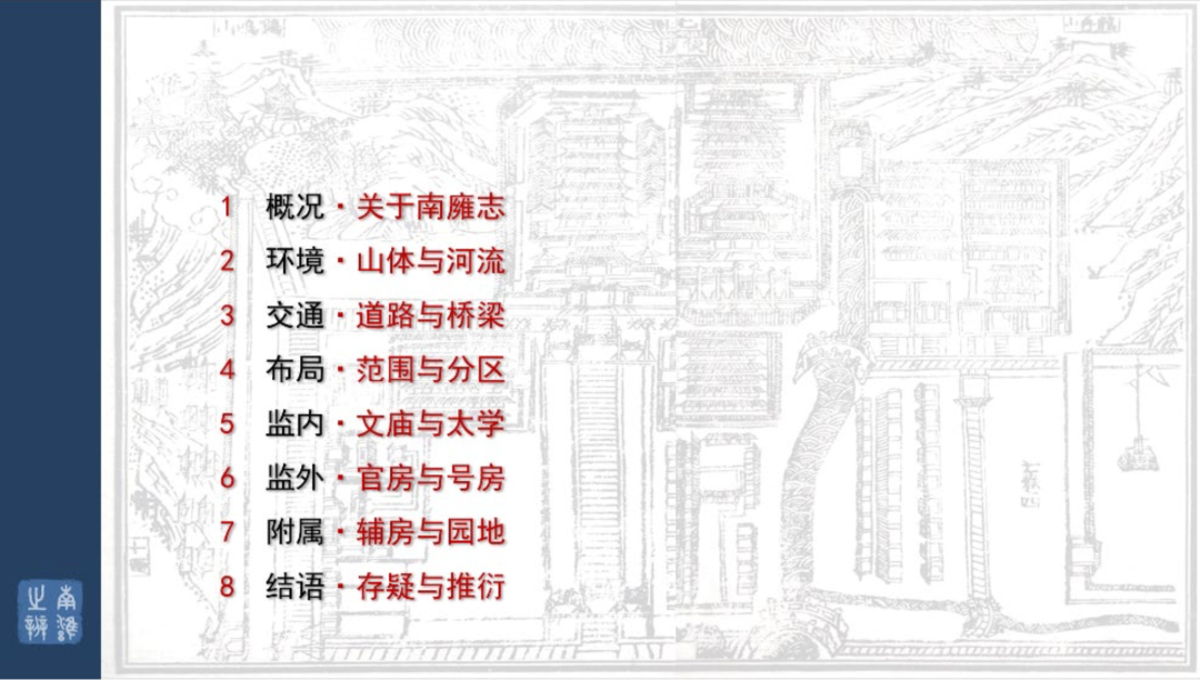 明南都太学建于朱元璋吴元年(1366 年),明定都金陵后的洪武元年(1368 年)改为国子学,校舍均沿用元集庆路学。洪武十五年(1382 年)改建于鸡笼(现北极阁)山之阳并更名国子监。永乐元年(1402 年)设北京国子监后志名“南㢕”,以别于北京之称。其专志《南㢕志》成于嘉靖二十三年(1545 年)。全志共 8 册、24 卷,分:事纪、官职 表、规制考、谟训考、礼仪考、音乐考、储养考、经籍考、列传 9 部分。其中第五册卷七、 第六册卷八为“规制考”的上、下二篇就国子监的校园及建筑进行全面阐述。本寻踪共分 8 个章节,通过《南㢕志》中校园规划建设相关信息的矢量化分析与研究, 尽可能真实地再现国子监盛期的整体风貌,及其与东大四牌楼校园及周边区域的空间关联。
