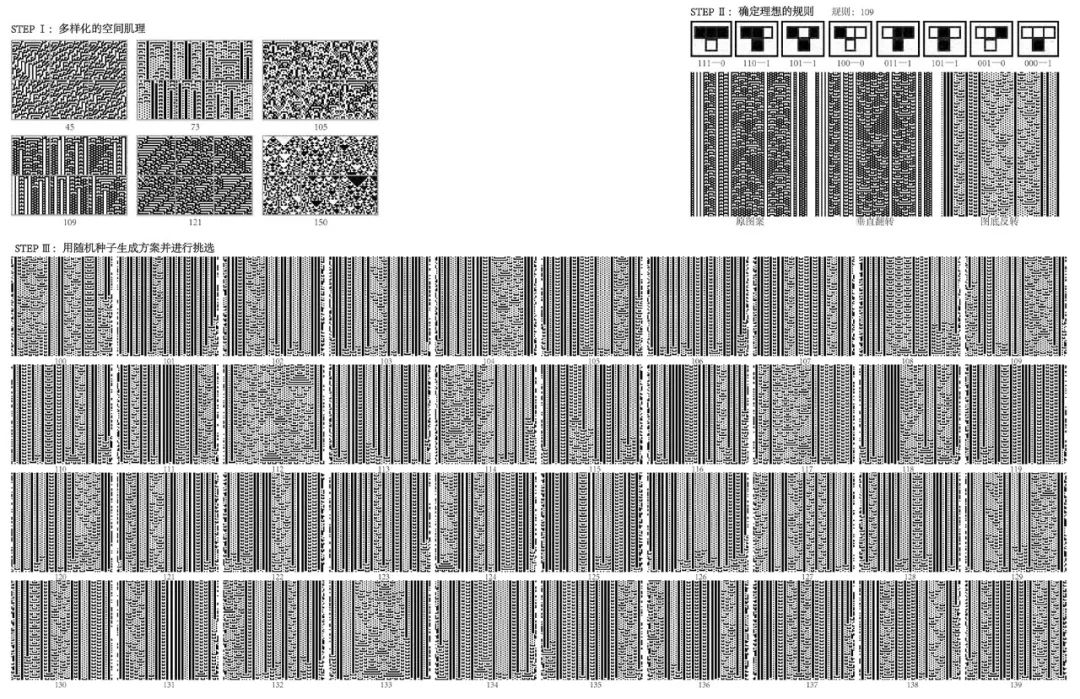 虽然空间相互作用和时间因果关系仅发生在局部,但CA具有复杂的时空演化行为。以Stephen Wolfram的一维CA系统为基础,本方案利用Processing编程工具自定义CA,创建了多种的小区平面秩序,探索了有效调节容积率与楼栋日照的方法。