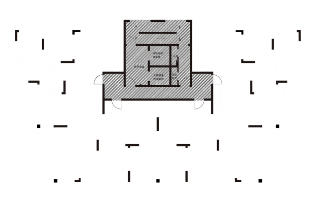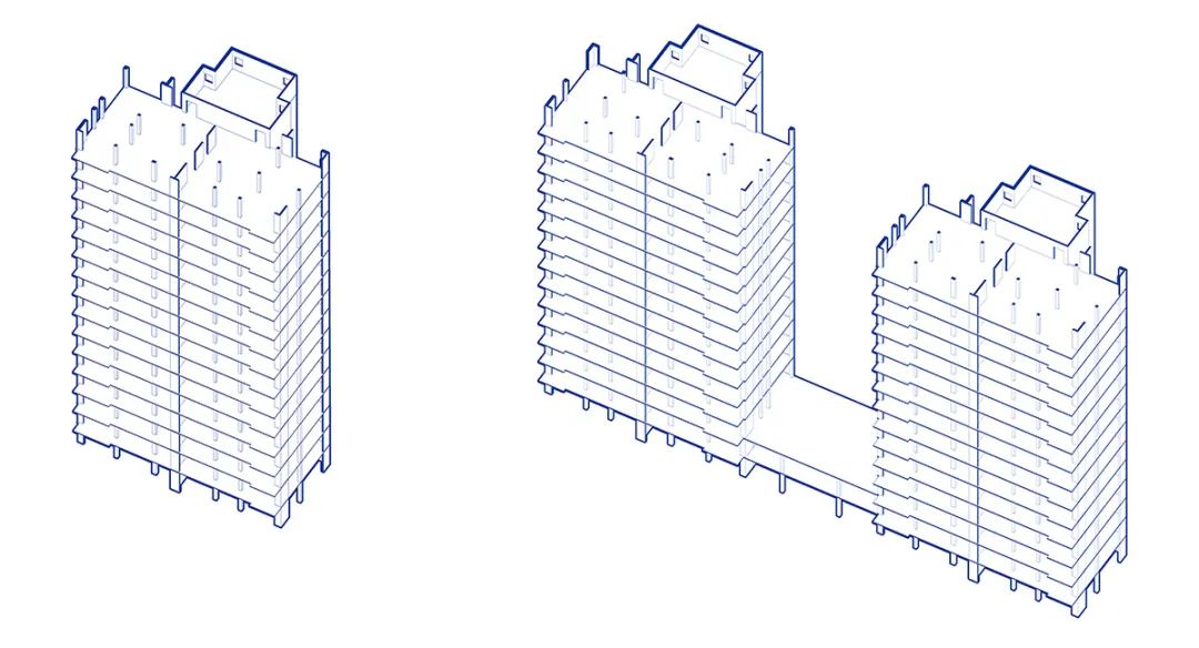 迭代运行的仿射变换(旋转、平移、镜像)生成了众多L形图元构成的分形。受到路易斯·康的理查德医学研究所(Richards Medical Research Laboratories)的结构形式的启发,调整宏观参数的取值,生成了极其多样化的平面构图,进而把最合适的平面构图映射到住宅结构与空间。通过形式语法的参数来控制L形剪力墙之间的间距,使其能够在不同的时段、不同的楼层容纳多种房间布局,但应避免跨度过大导致的高昂造价和厚重楼板。