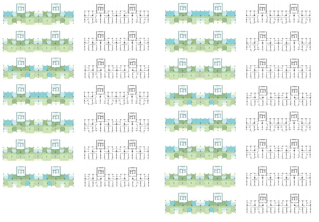 2组、3组或4组L形住宅单元(及其领域)形成一个组团。基于MOEA优化器实现了空间分配(space allocation)算法,将各种组团紧密排布在16万平方米的基地中,形成了错落有致的小区空间秩序。小区由T2、T4两大类高层住宅构成,可以灵活地容纳从60平米到150平米的多种套型。