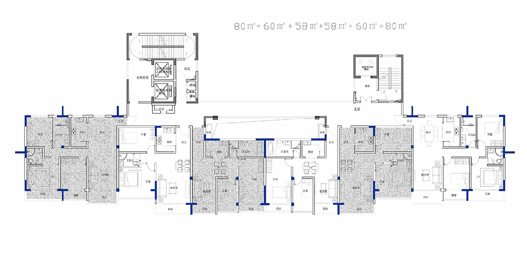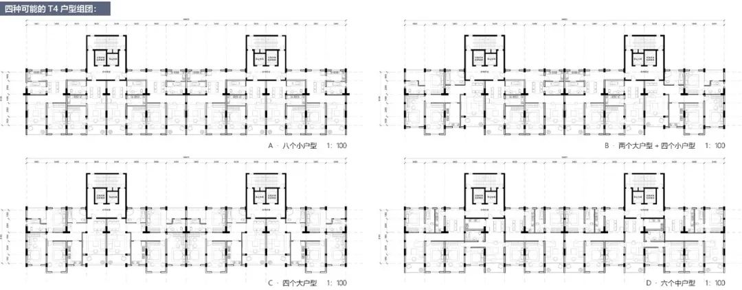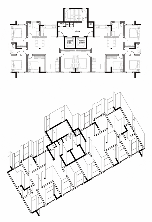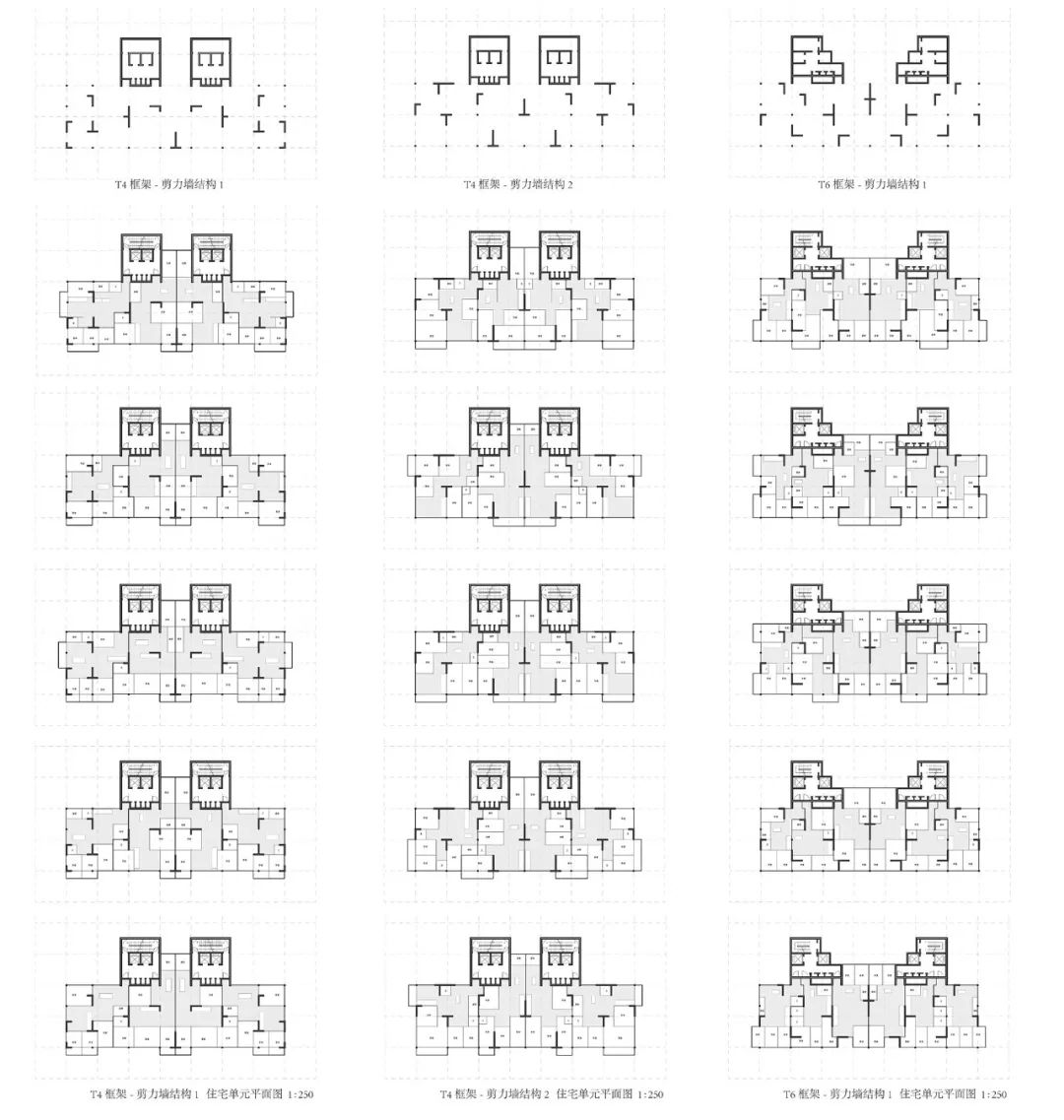 这种方形生长的逻辑也用来生成住宅单元的主体结构形式,并为每种框架剪力墙布局设计了6种套型,初步验证固定结构系统能够容纳多种房间布局。