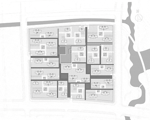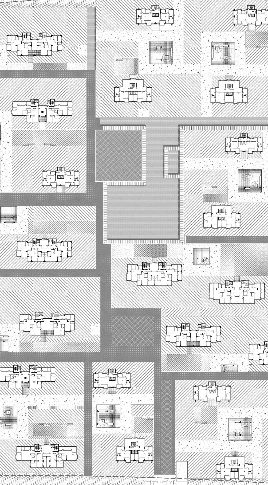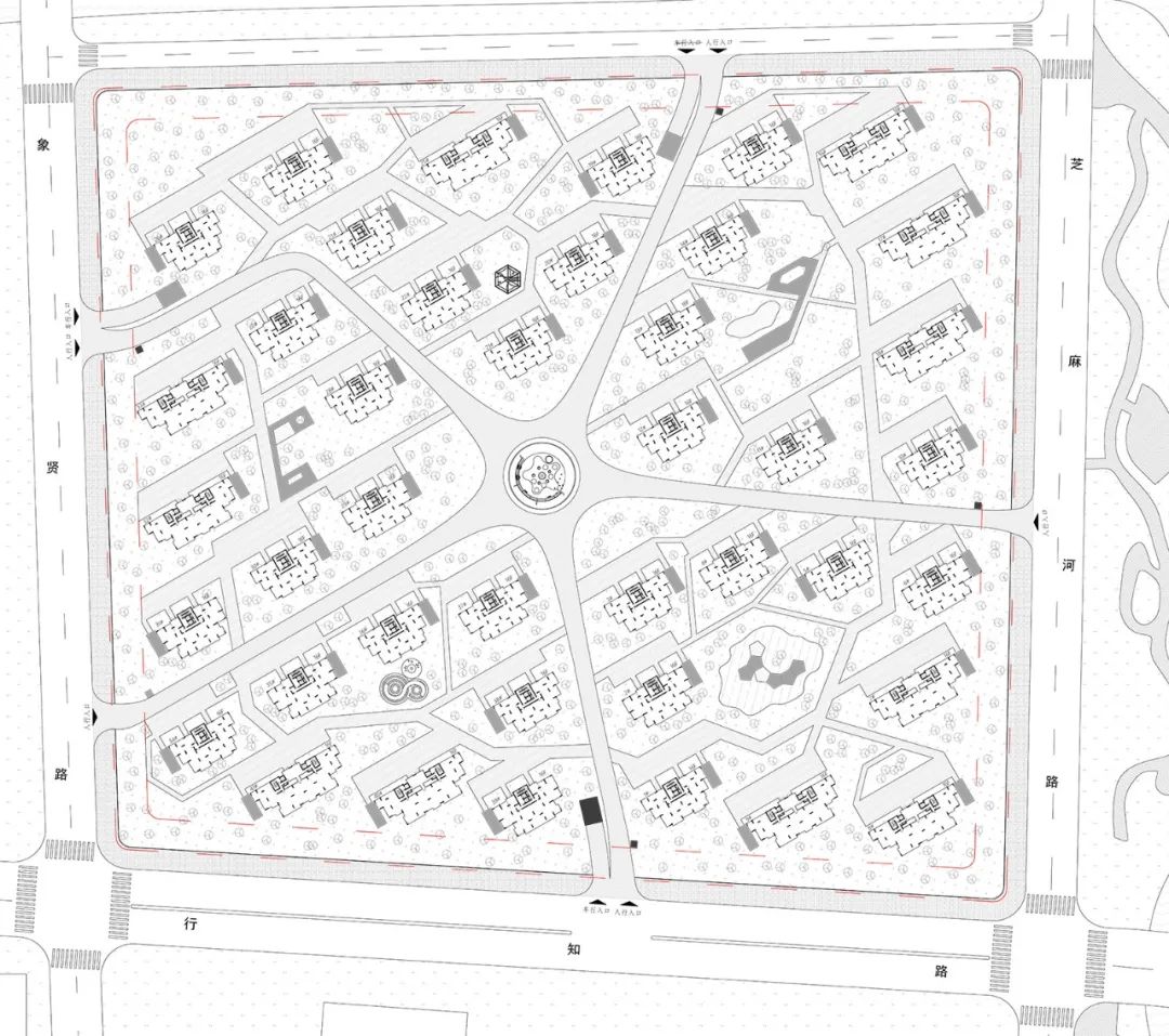 场地分为若干个区域,分隔线形成小区主干道。每个区域内以双曲线轨迹(hyperbola)、边界轨迹排布住宅单元,自然而然形成住区内部的围合与公共空间。由此在小区内形成具有簇团逻辑的住宅组团。