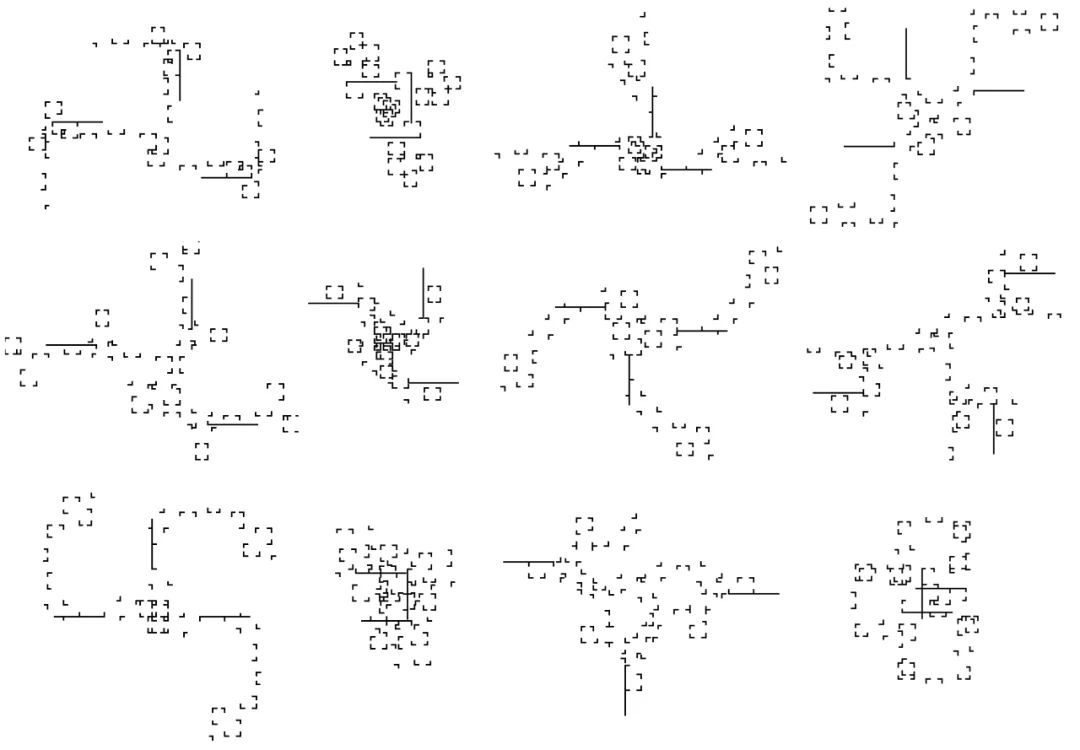 自组织(self organization)的博弈过程形成了住区总平面的楼栋布局。每个住宅单元所在的领域以一个尺寸可变的长方形来表示。每个长方形试图膨胀至较为充裕的面积。所有长方形在基地内相互竞争,一方面促使容积率上升至较高的预定值,另一方面保证了楼栋之间的间距与日照条件。
