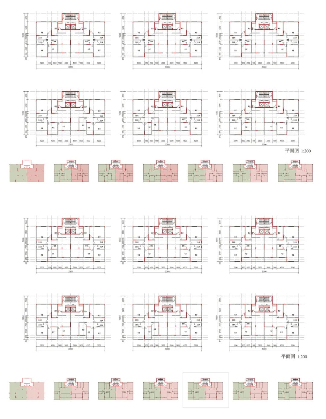 住宅单元结构系统设计参照了《The Mathematics of the Ideal Villa》的平面模数理论和贾倍思《长效住宅》的设计建议,探索了一种多适性的结构网格,使其能够灵活地容纳日常生活所需的空间。在固定的框架剪力墙结构中模拟可能的房间布局,考虑“稳定体”(如卫生间具有较多的管道限制)与“易变体”的区分,以模拟住宅的长期高效性。