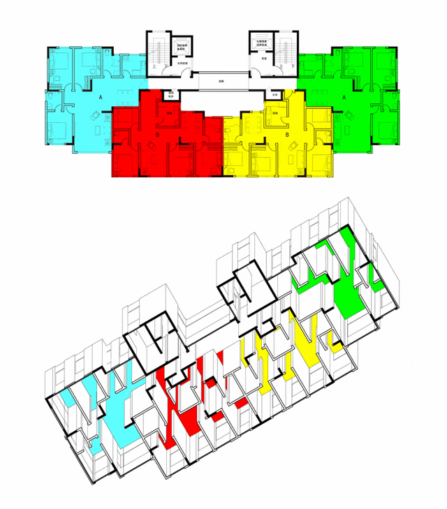 本方案利用Processing编程工具,对T2、T4住宅单元的主体长方形轮廓进行迭代细分。在平面构成内部的角点部位设置柱子或L形、T形剪力墙。细分过程中的参数可以调控这些承重结构之间的间距,使其能够容纳多种房间排布方式。固定的承重结构与相对灵活可变的房间划分形成了有趣的时空交错。