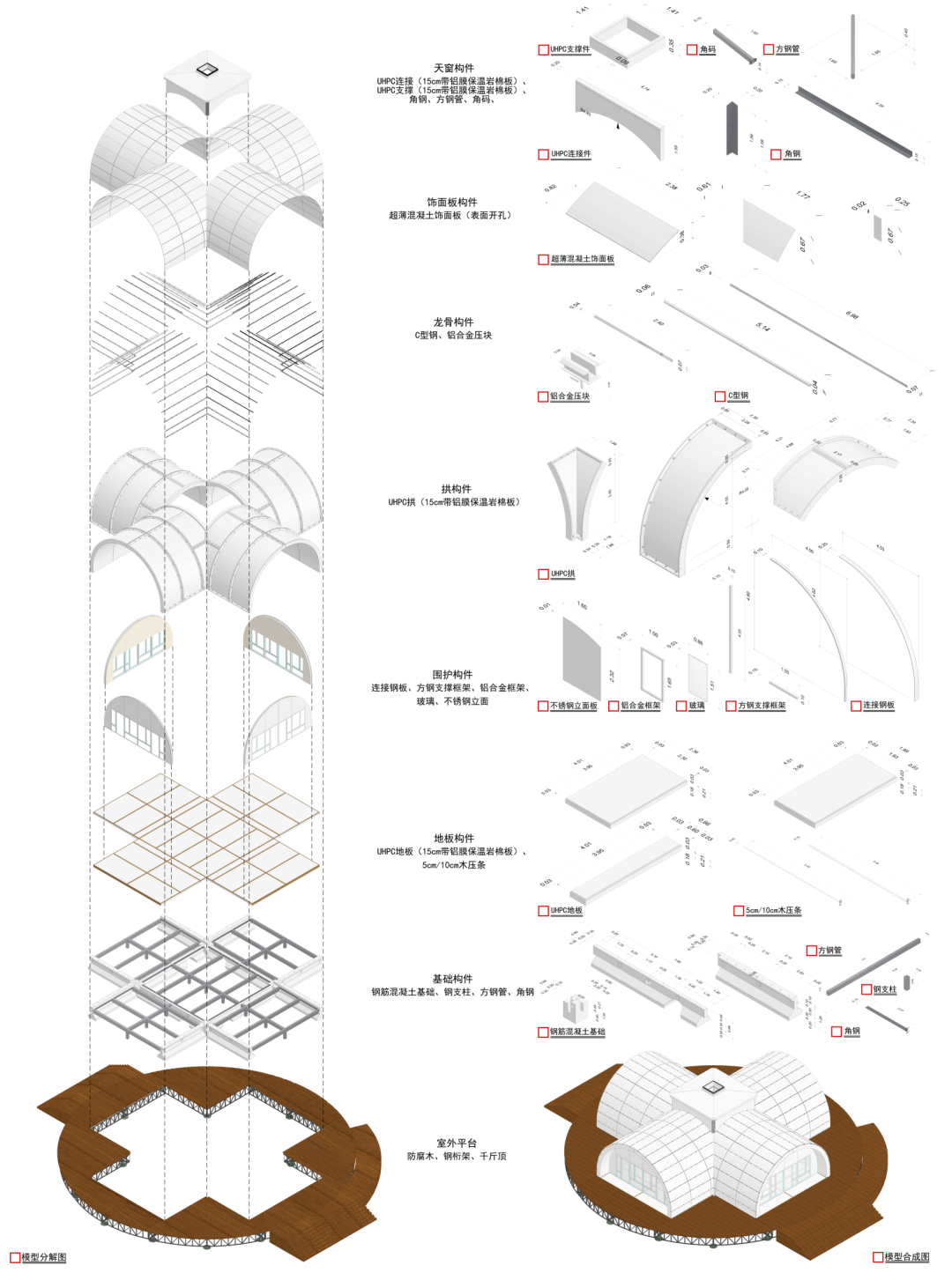 自2018年以来,一楼一凤 张宏教授团队持续致力于生态混凝土UHPC(Ultra-High Performance Concrete,超高性能混凝土)的创新技术应用,旨在构建全生命周期的绿色低碳建筑。团队采用预制装配UHPC曲面结构建造技术,充分发挥UHPC卓越的抗压性能,在保证结构安全的前提下,减少混凝土的用量并提升建造效率,降低建筑建造对环境的影响。所有构件均采用工业化预制装配可逆拆装技术,使建筑在未来的改造或搬迁中能够轻松拆卸与组装,减少建筑废弃物对环境的破坏。同时,得益于UHPC的高耐久性,建筑主体结构的使用寿命得以延长,减少了维护和修复的频率,进一步降低建筑运维的碳排放。