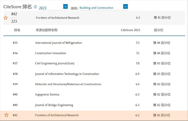 ▼ 2023年度FoAR CiteScore 指数在建筑工程领域排名超过84%的期刊。