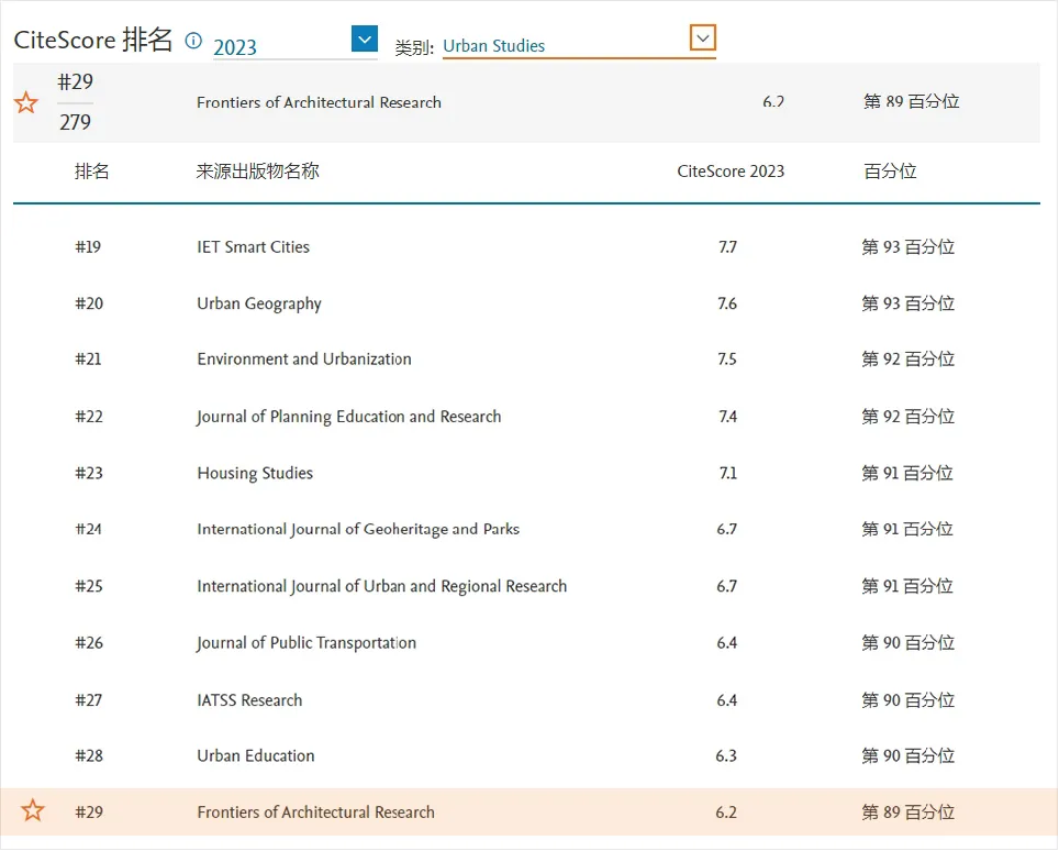▼ 2023年度FoAR CiteScore 指数在城市研究领域排名超过89%的期刊。